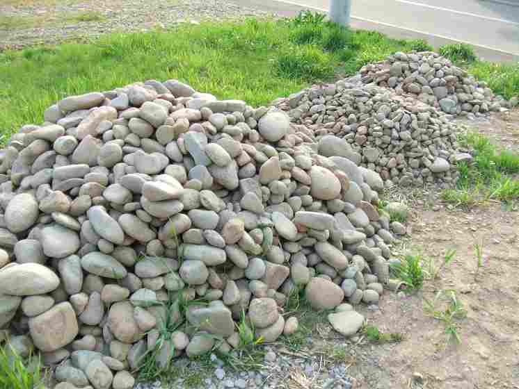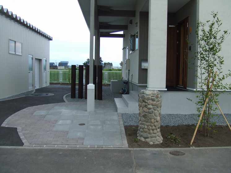 これは、オーナー様の敷地内から出た玉石です。掘削中多くの玉石が残土の中に混入して、その量が半端でなかったので、これは使えると思い、ふるいに掛け適度な玉石だけ残し、門柱や仕切りに使いました。宝って思わぬ所に眠っているんだなぁと思いました。