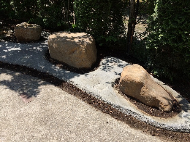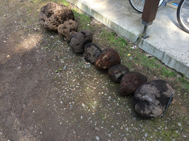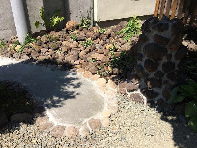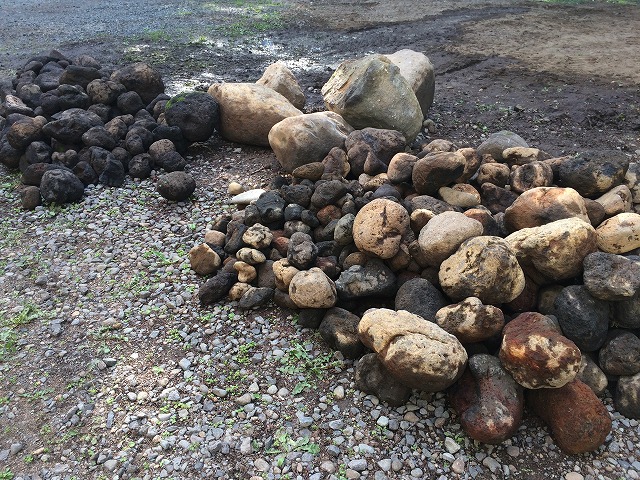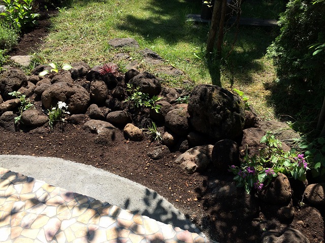 現場敷地内で掘り出した、山石や焼石を使用しています。お客様が庭の作業をしていると、土を掘るたびに出てくるというのを聞き、「これは掘ればもっと出る!」と思い掘り出してみると・・・予想が的中!色々なお庭のシーンを造り上げてくれた宝の山でした!
