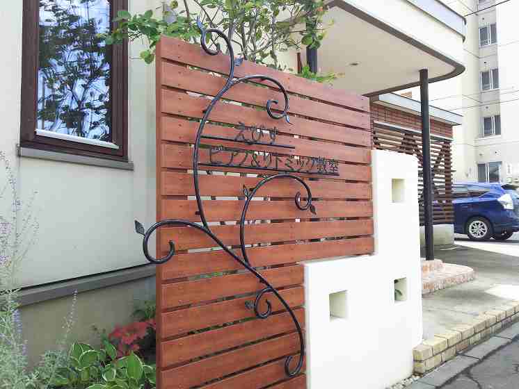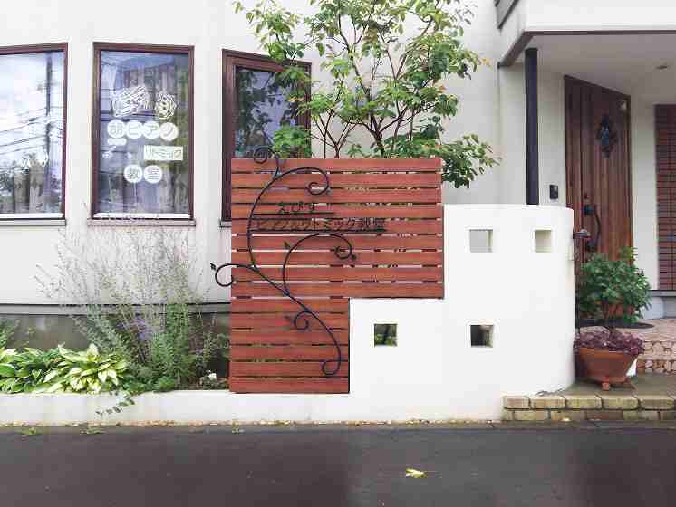 もともとあった門柱に、アルミ製のウッドフェンスとオリジナルアイアンのサインを付けました。