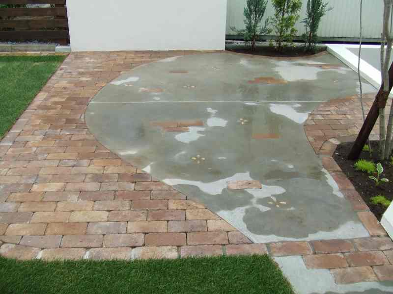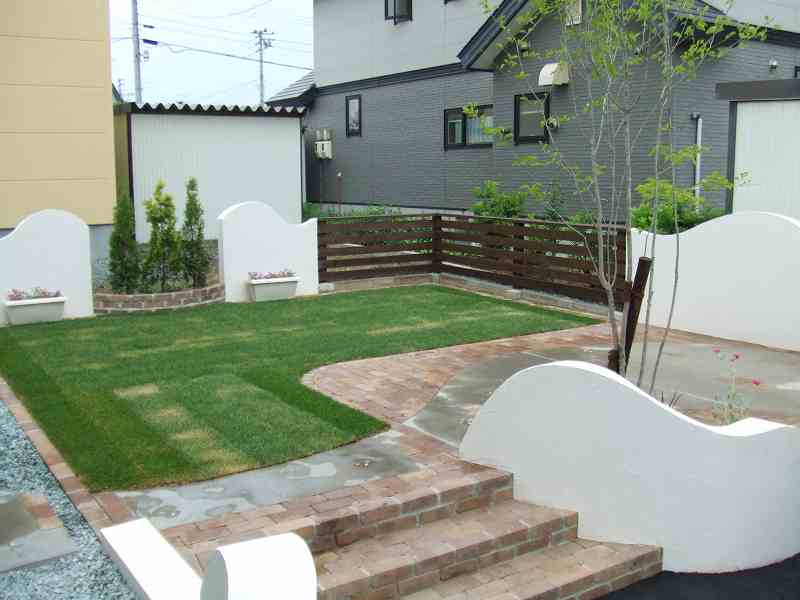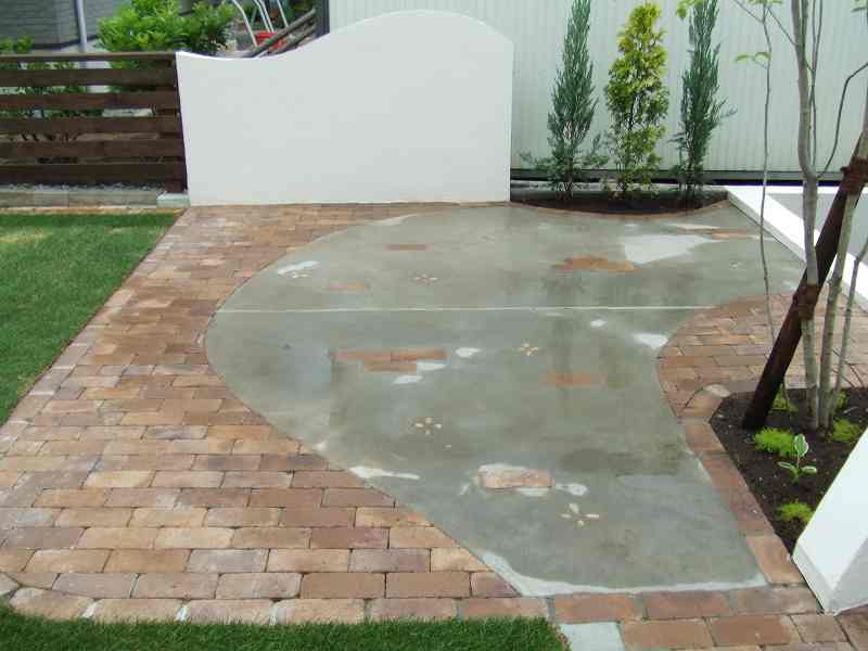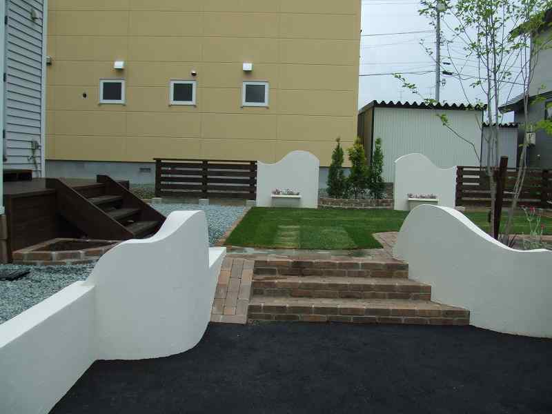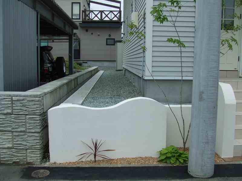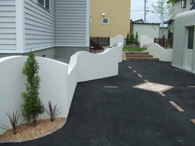 距離が長い堀にはウェーブをふんだんに取り入れました。ウェーブが入り立面的な視点は面白味が増しました。庭の外側も植栽とウッドフェンスにより閉塞感が軽減されています。