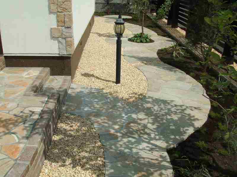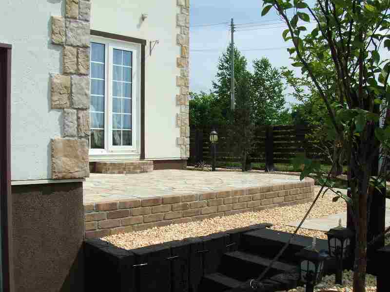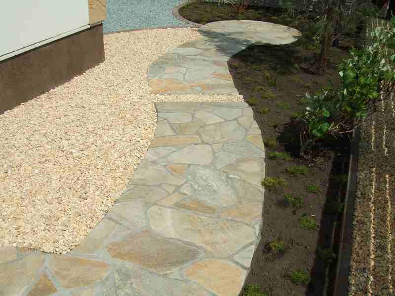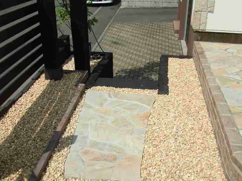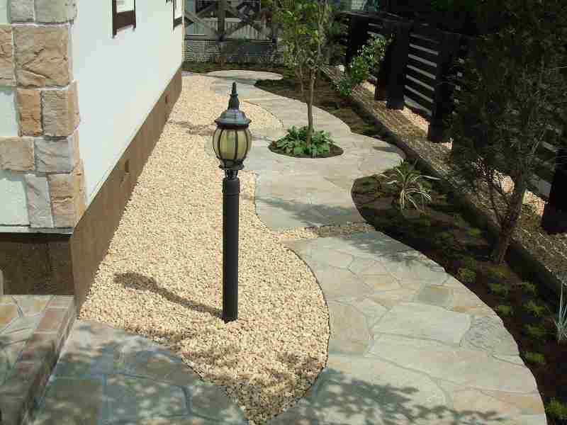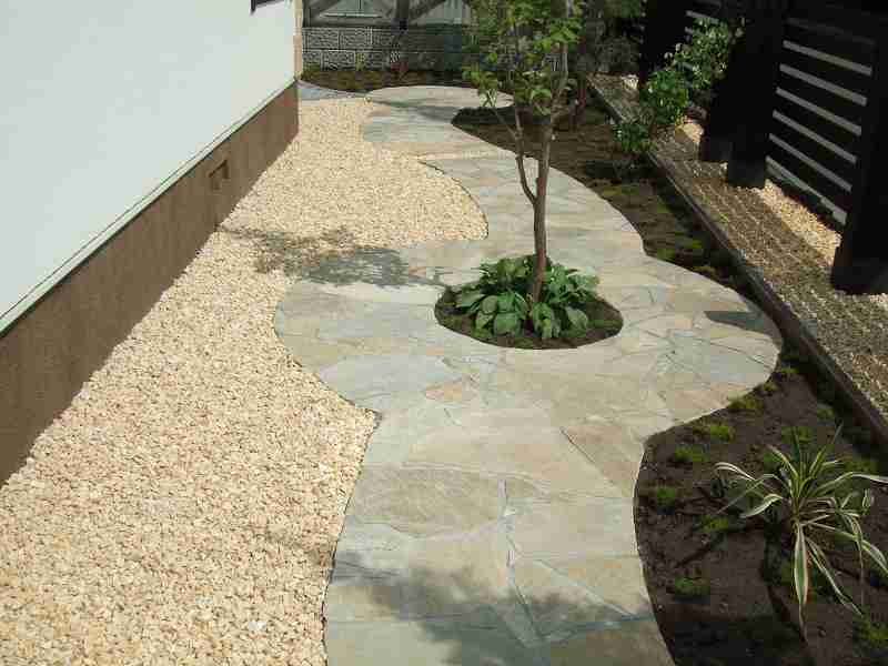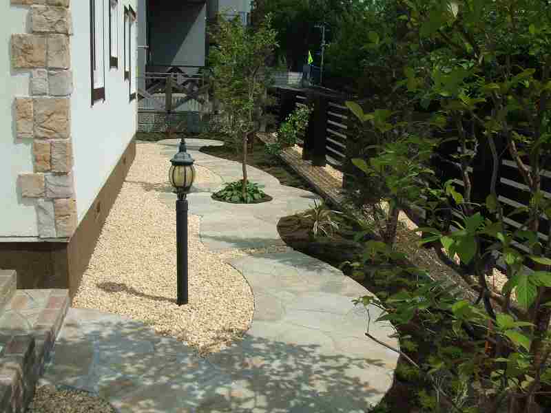 もともとウッドデッキと芝生でしたが、ウッドデッキの破損を機にクォーツサイトのテラスとガーデンパスを広めに作りました。管理面のことを考えつつグリーンスペースは確保した上で、モスを植栽しました。