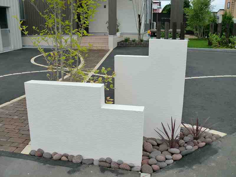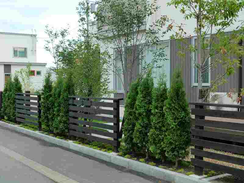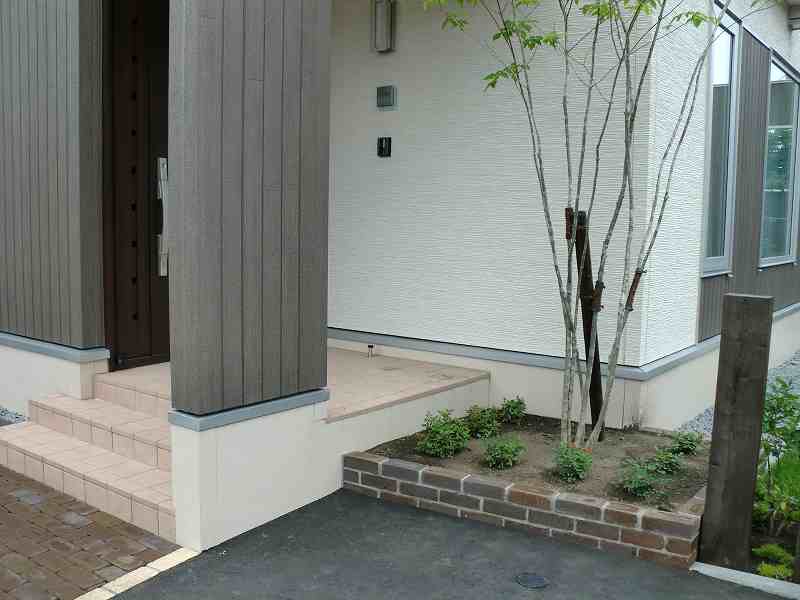 アプローチはデザインにこだわりつつ、アプローチとしての機能も当然兼ね備えたデザインにしました。庭のスペースは植栽をふんだんに取り入れ、ウッドフェンスの間にも樹木を挟み、グリーンの壁で癒しの空間を造りました。