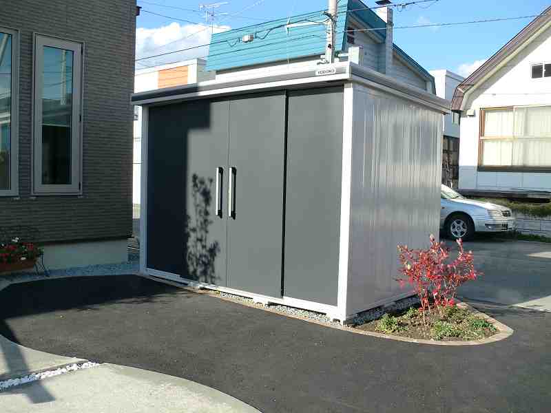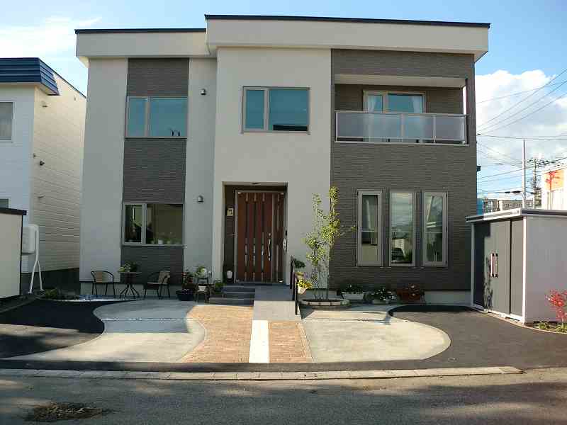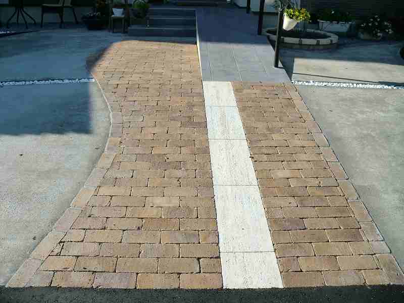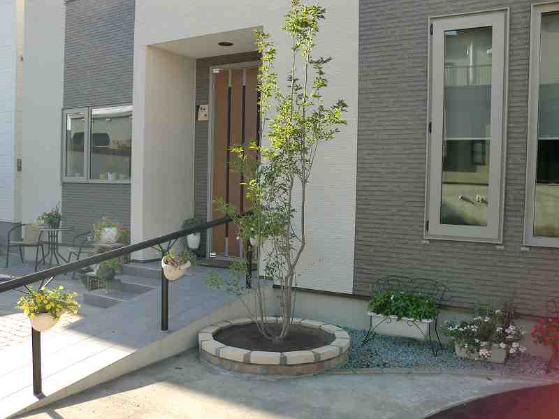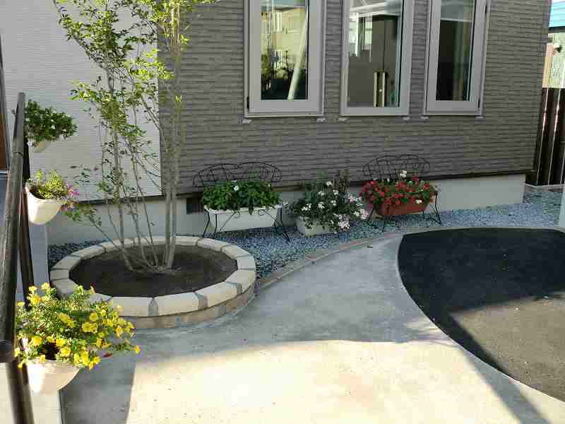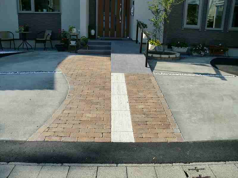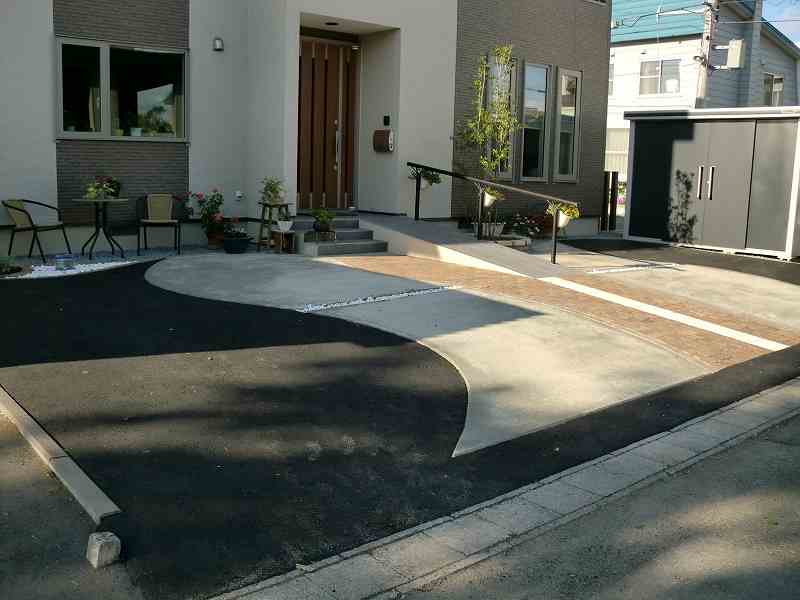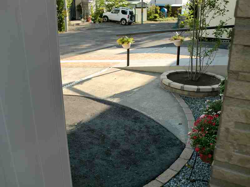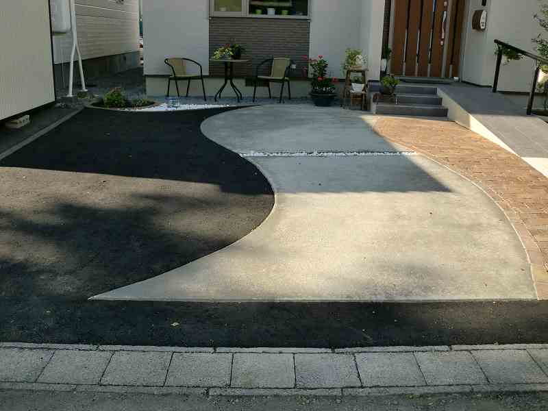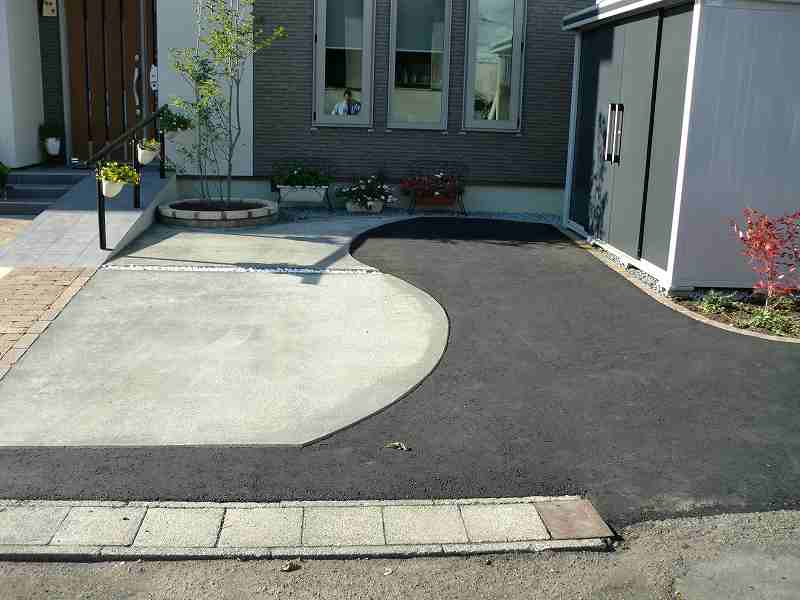 アスファルト舗装だけの駐車場だと面白味に欠けるということで、コンクリート舗装とアプローチにRを加えることで、平面的な部分も面白味が出たカースペースとなりました。