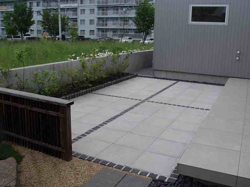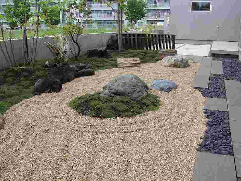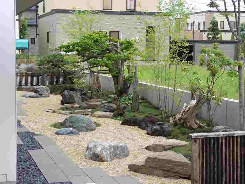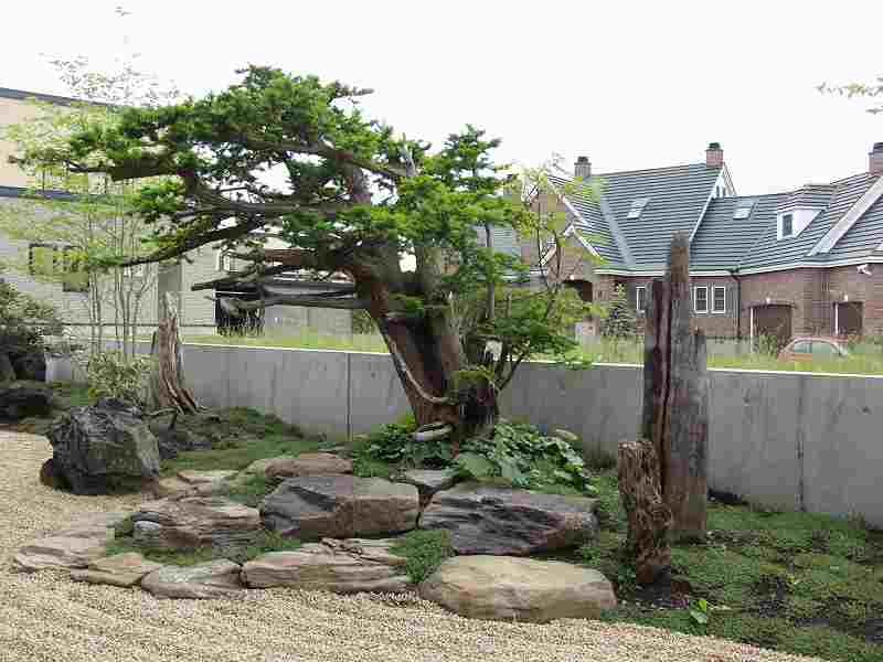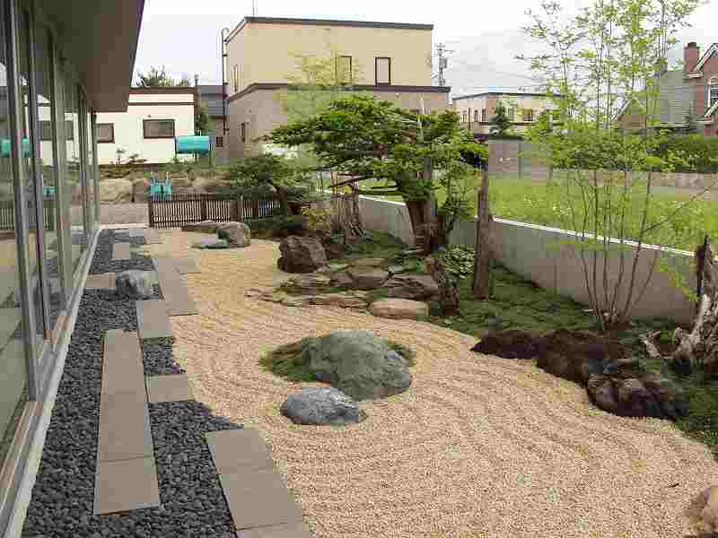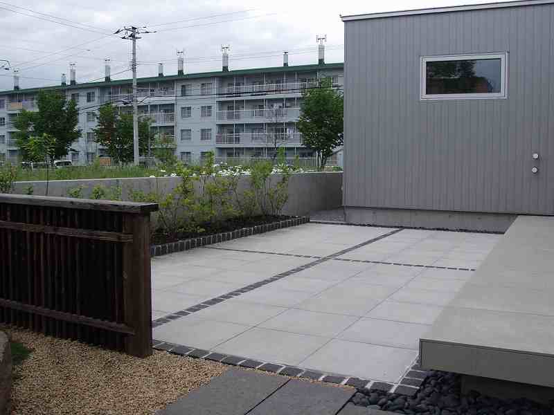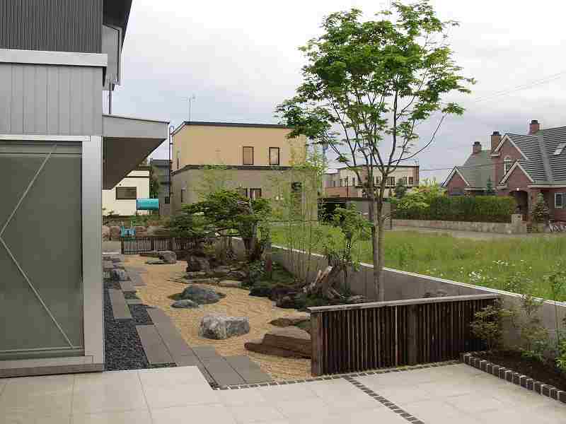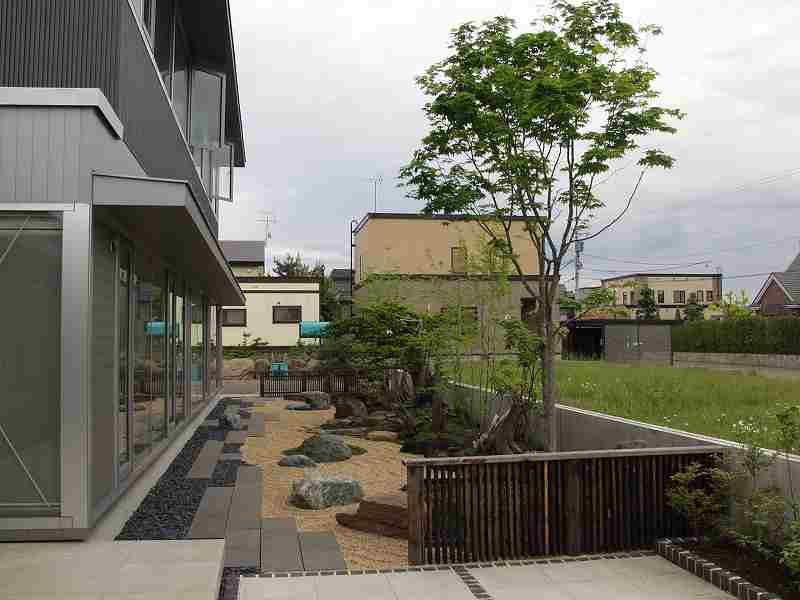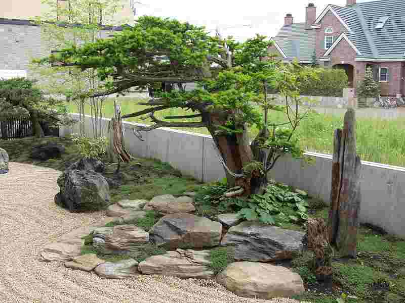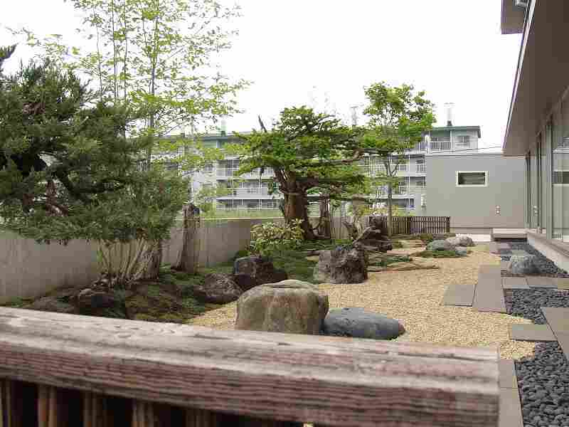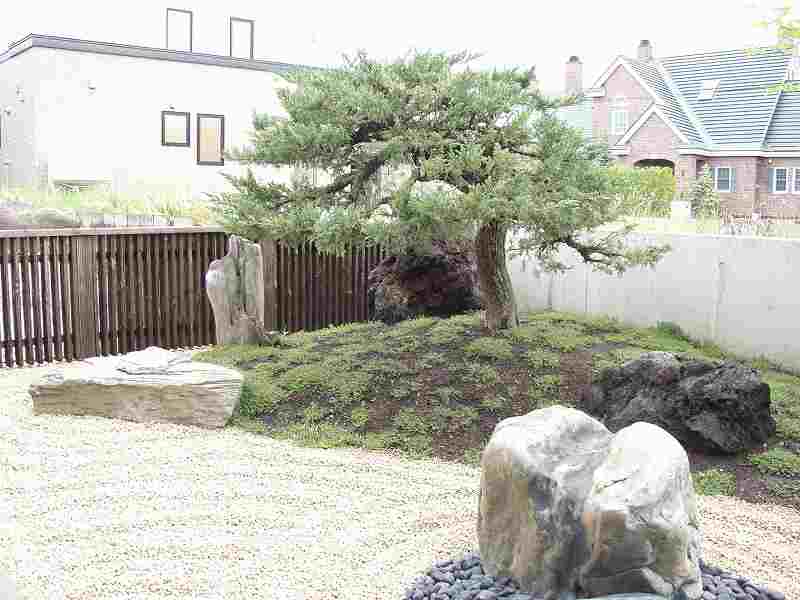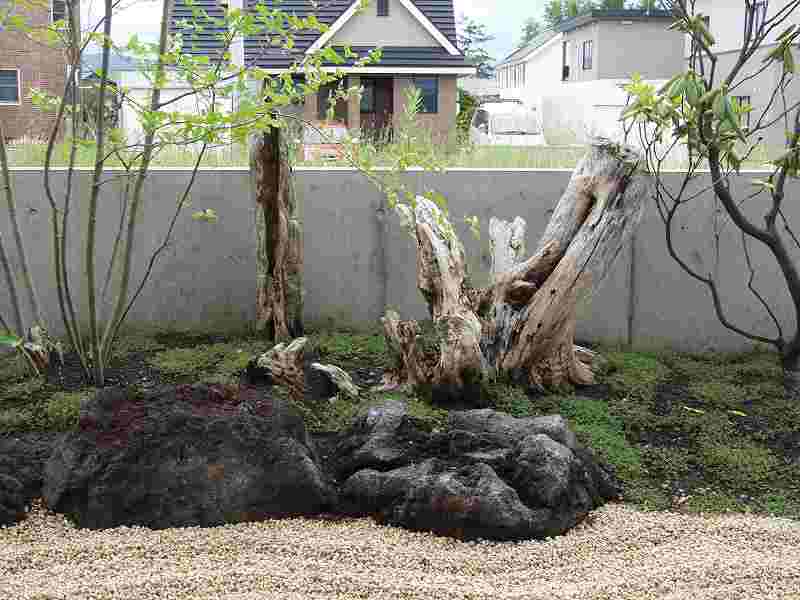 火山の爆発で焼けてしまった海岸が再生していく過程を形にした。 オーナー様の『人の手の加えられていない自然の形のイチイが植えたい』と言う要望からヒントを得て、デザインした庭です。又本来はサービスヤード的な部分でしたが、残された空間をもう一つのリビングとしてテラスを設け家族団らんの場や外からもゆっくり庭が鑑賞できるスペースが造れました。テラスの奥にはコンクリート塀を隠すようにブルーベリーが植栽され、庭全体が緑に囲まれた空間としました。 |