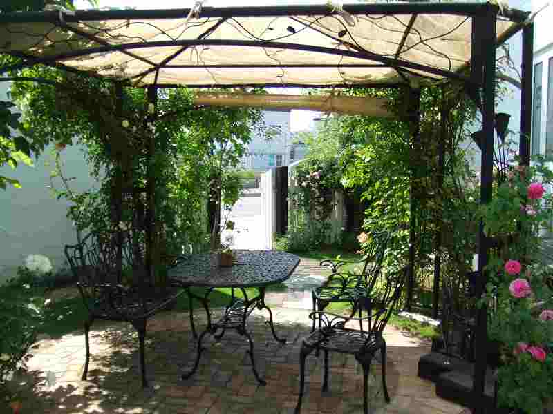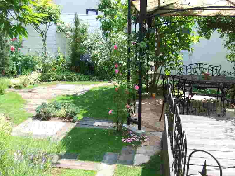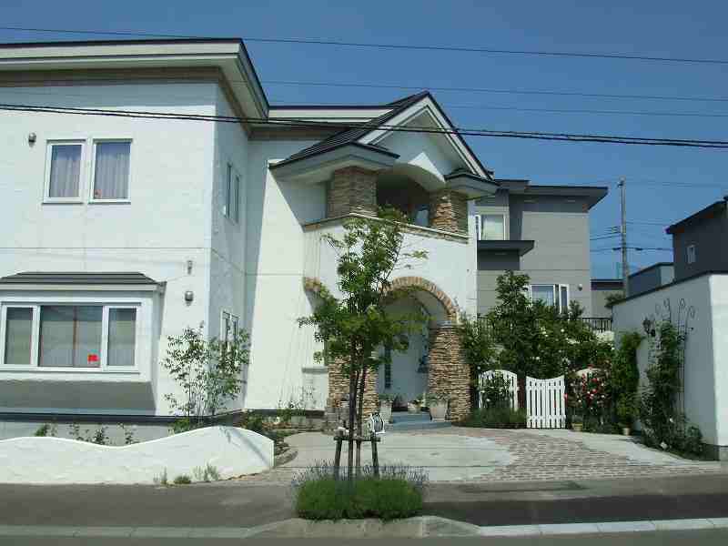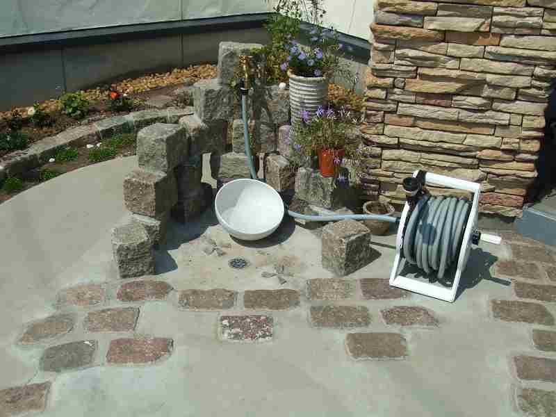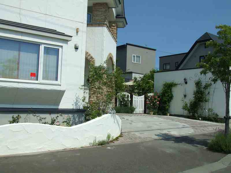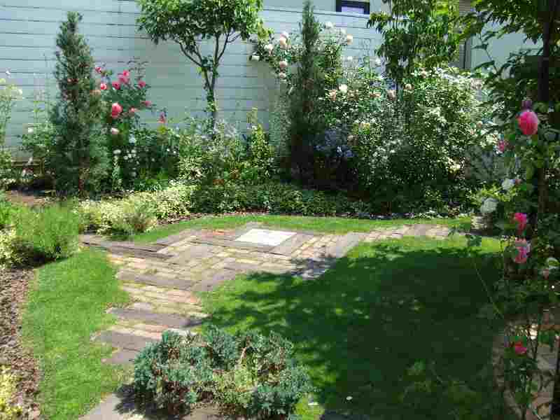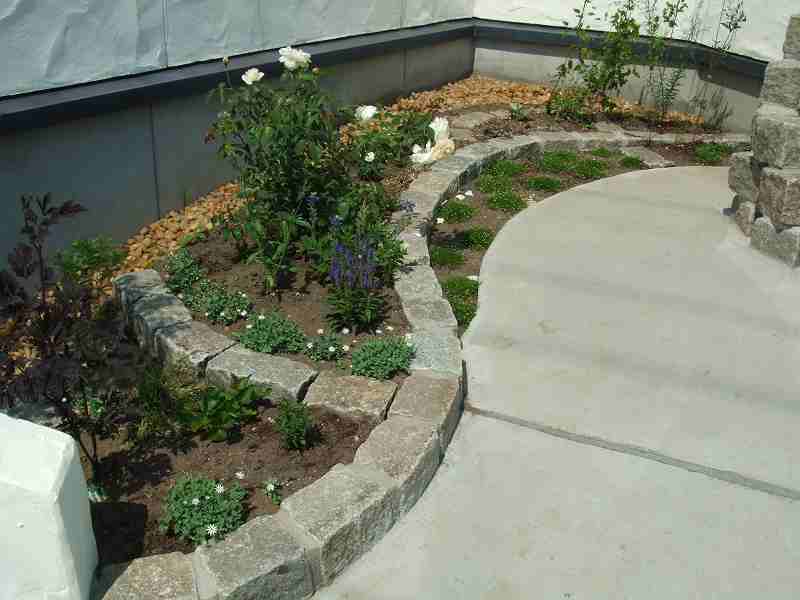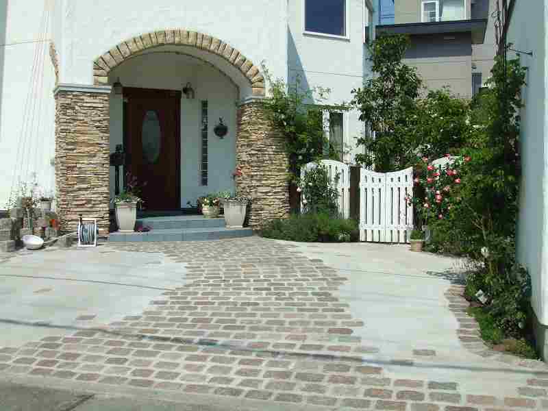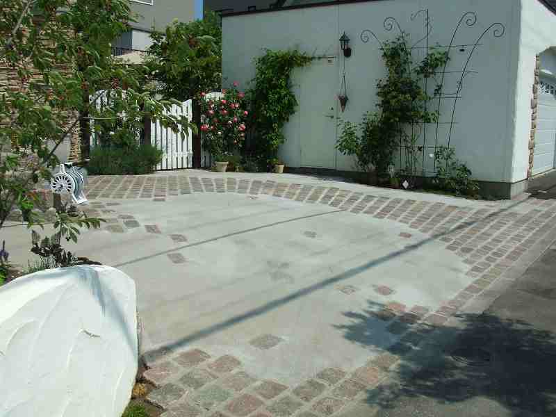 | アプローチと駐車スペースが主体の工事で、アプローチ・植栽エッヂ・立水栓には、実際ヨーロッパで使用されている石を使用しました。全体的に石畳を使用しても良かったのですが、よりアプローチに存在感を持たせ目為に、コンクリート舗装の中にアプローチを石畳で設けるました。アプローチとコンクリート舗装でかなり広いスペースになってしまいましたが周りの生かされたスペースは、出来るだけ植栽スペースとし、アフローチや駐車場スペースも庭の一つとして確立しました。 |