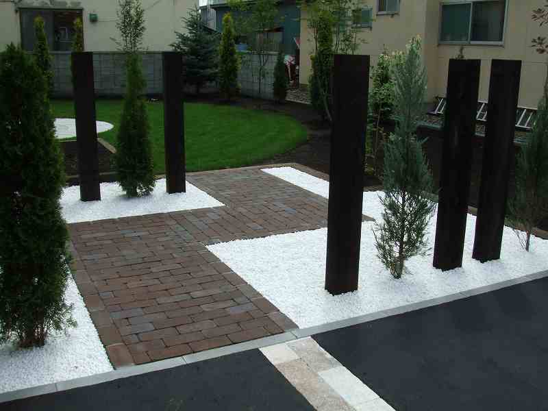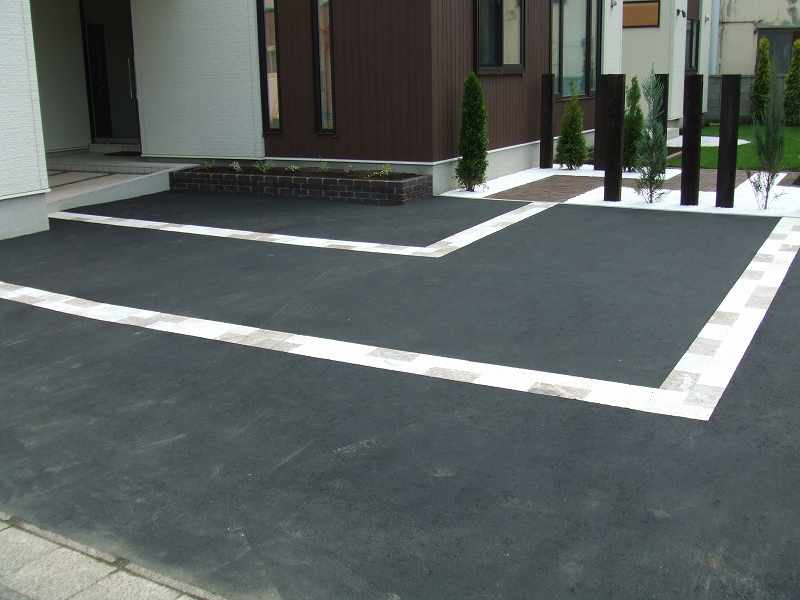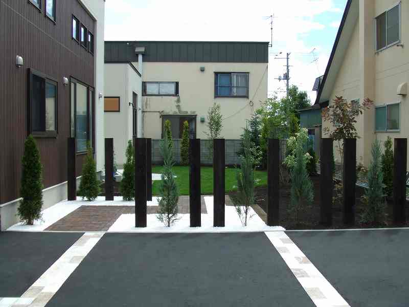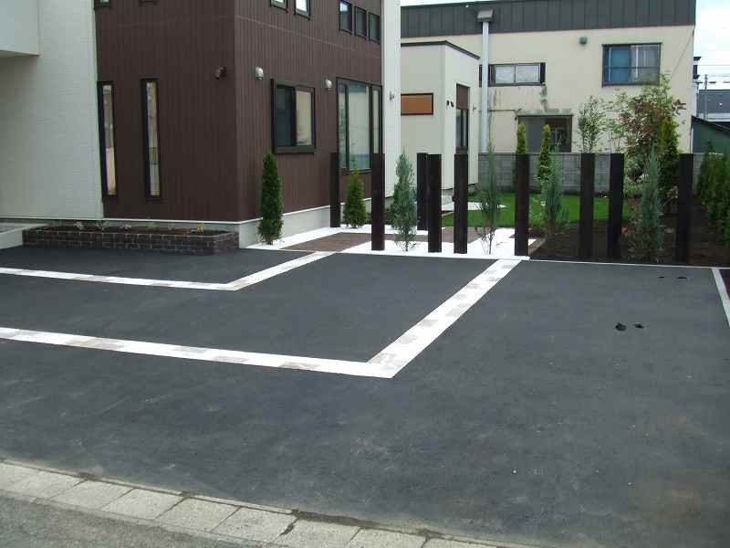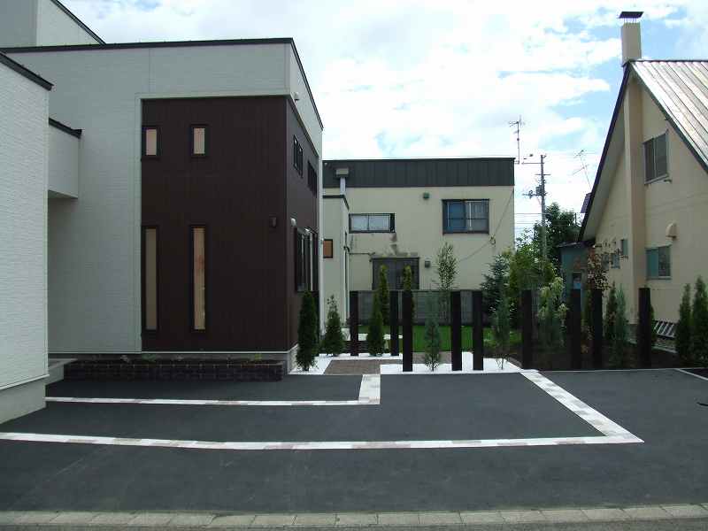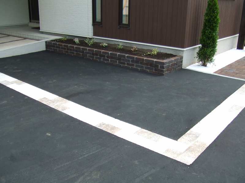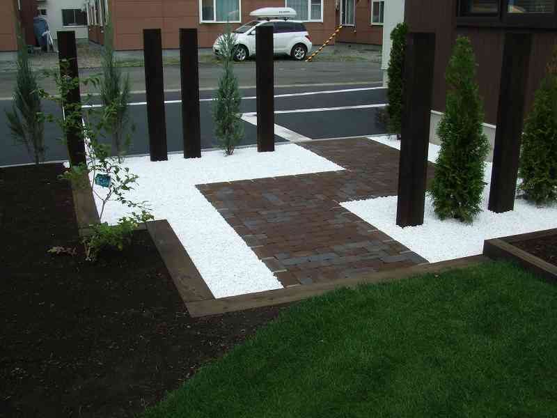 | 全体的には住宅に合わせて、ブラウンとホワイトを基調に家族が楽しめて閉塞感がなく、かつ植栽をふんだんにということで、あえて周りは塀やフェンスなどをまわさず、植栽樹木で目隠しをしています。前側は道路にも面している為、枕木(エコ枕木)を立てその間に樹木をはさみました。駐車スペースのアスファルト舗装は広めだった為、コッテージストーンを使用して、アクセントをつけました。 |