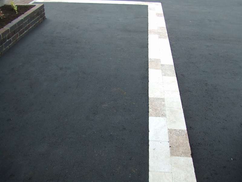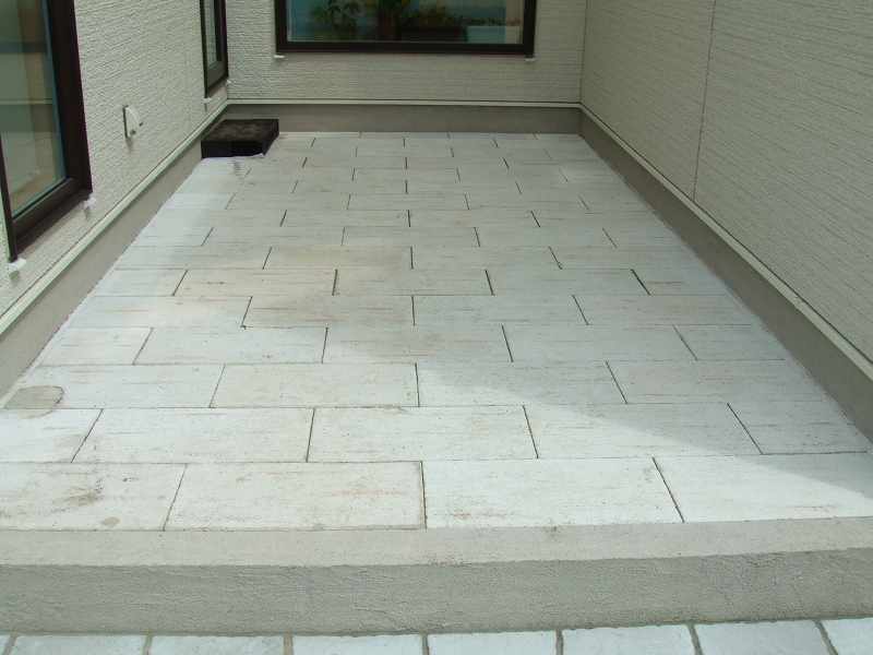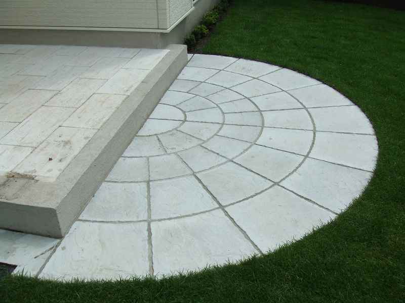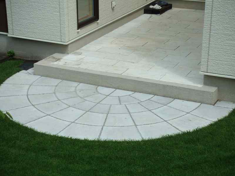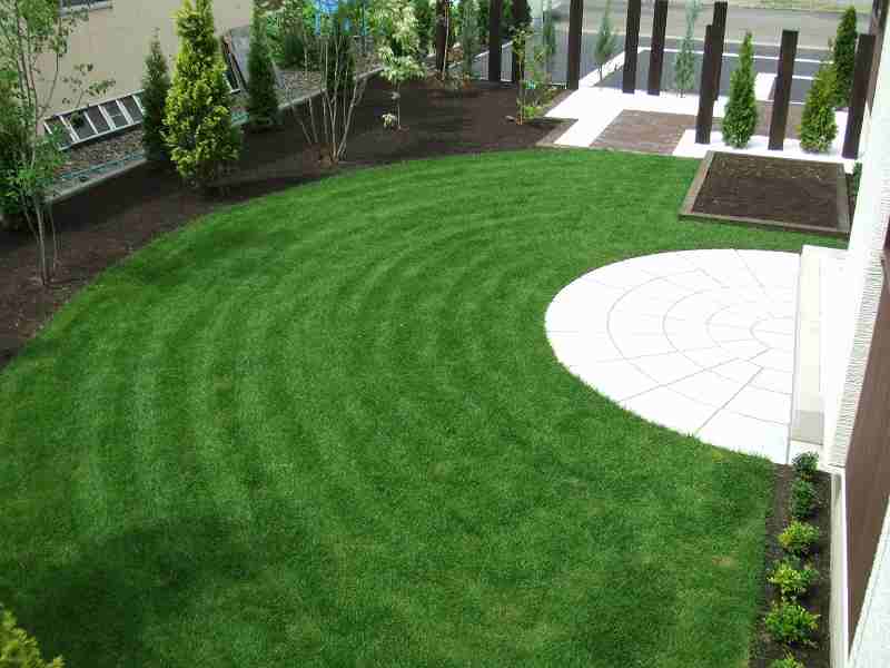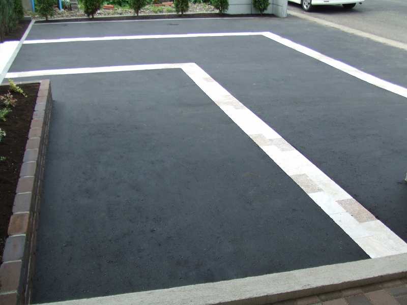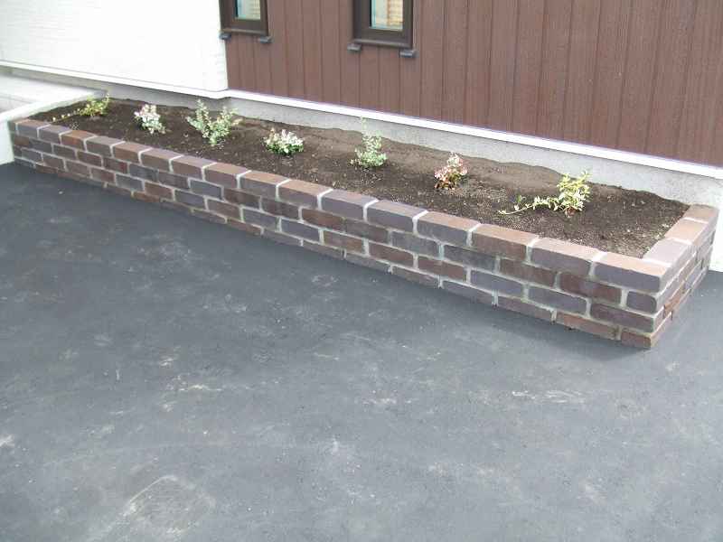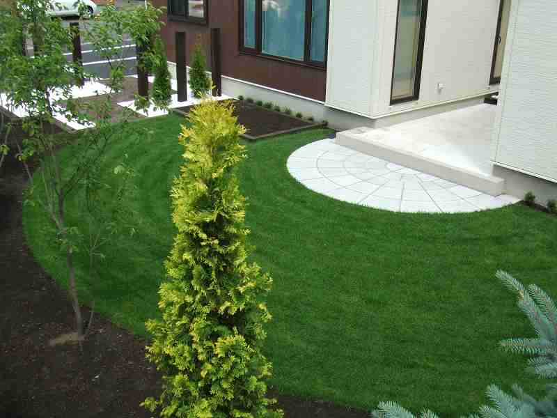 | 全体的には住宅に合わせて、ブラウンとホワイトを基調に家族が楽しめて閉塞感がなく、かつ植栽をふんだんにということで、あえて周りは塀やフェンスなどをまわさず、植栽樹木で目隠しをしています。前側は道路にも面している為、枕木(エコ枕木)を立てその間に樹木をはさみました。駐車スペースのアスファルト舗装は広めだった為、コッテージストーンを使用して、アクセントをつけました。 |