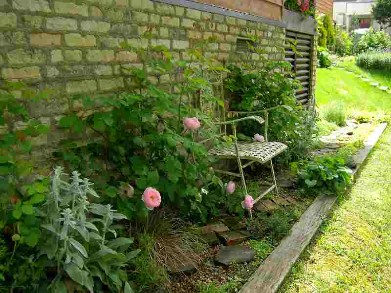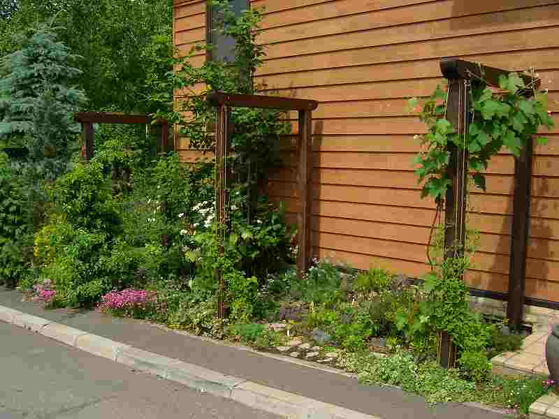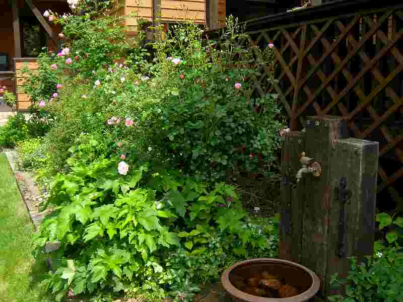 自然味あふれる中に各エクステリアやグッツがポイントとなり、目を引きます。バラ・花等の植栽・コンテナなど全て施主様の奥様が!