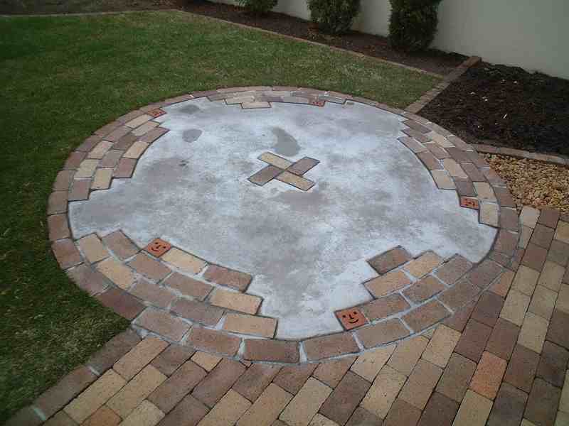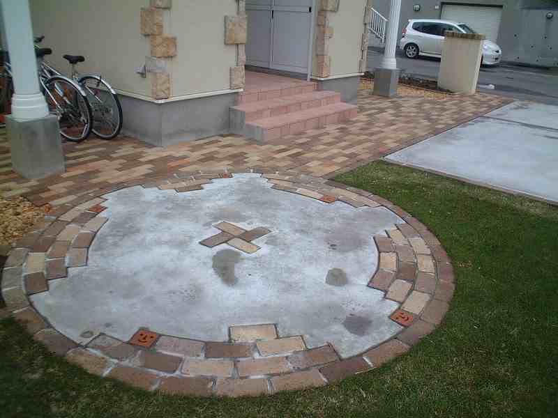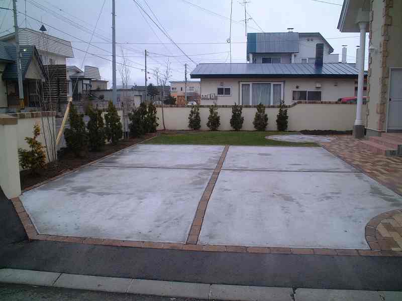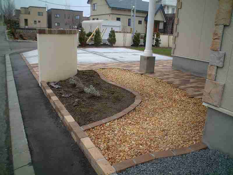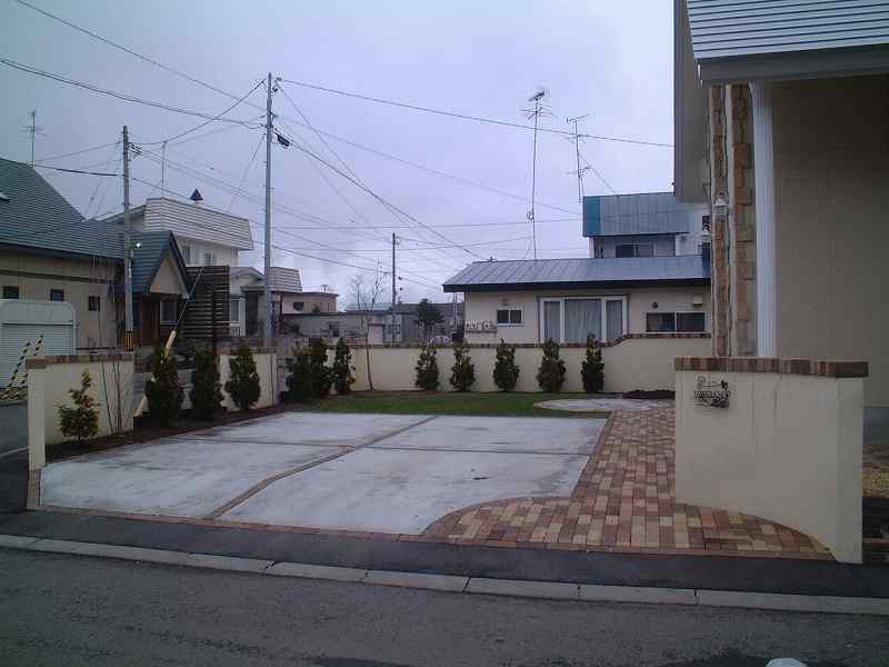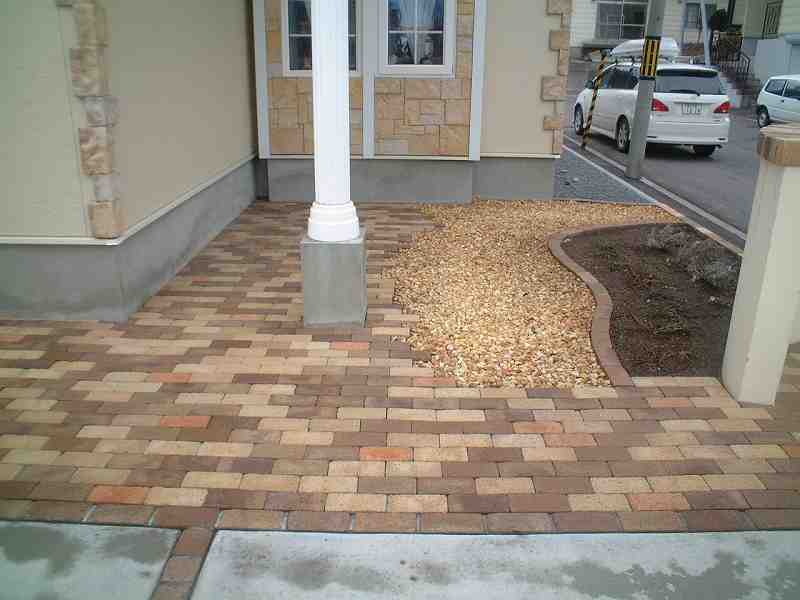 ソイルレンガを3色使い、クッキーブリックを組み合わせました テラスはレンガとコンクリートをミックスしました。 |