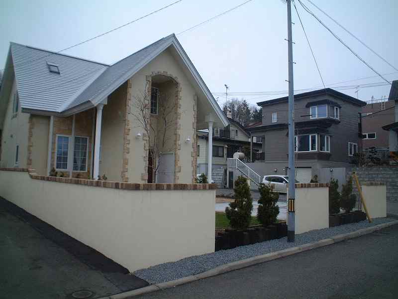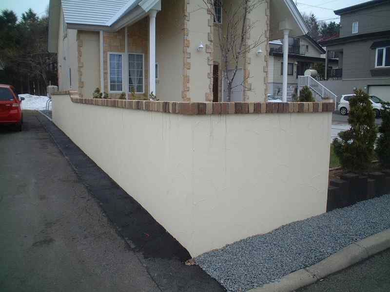 駐車スペースの横にレンガで、アプローチも確保。広めの駐車スペースは、レンガでラインを引きコンクリートで仕上げ、住宅の外観に合わせ、塀とレンガの配色をしました。笠木のレンガは、2種類使い、塀は、ランダムな左官仕上げで。