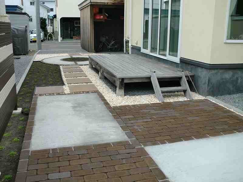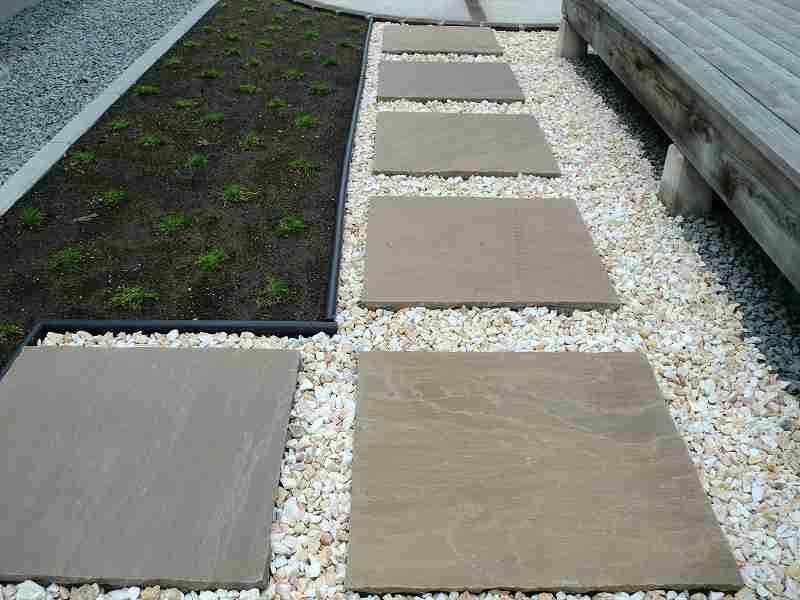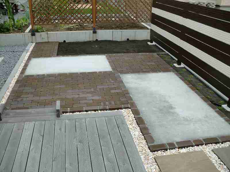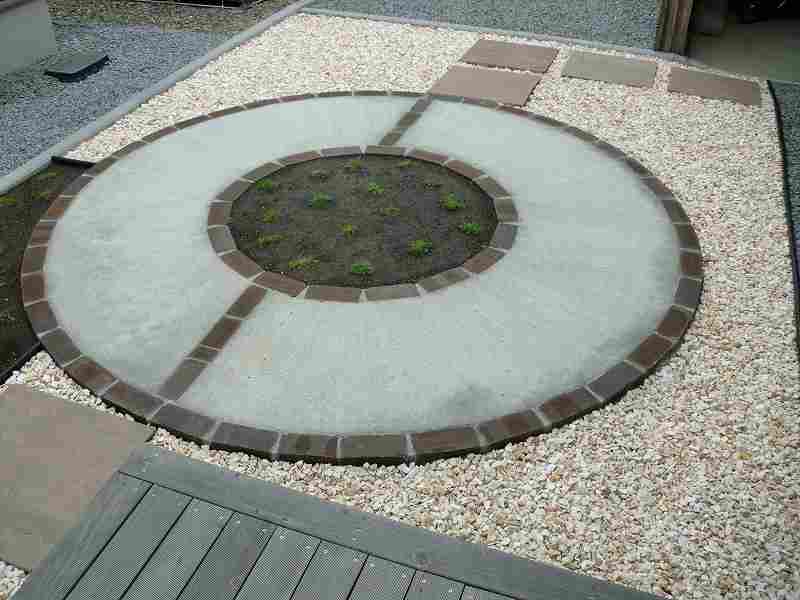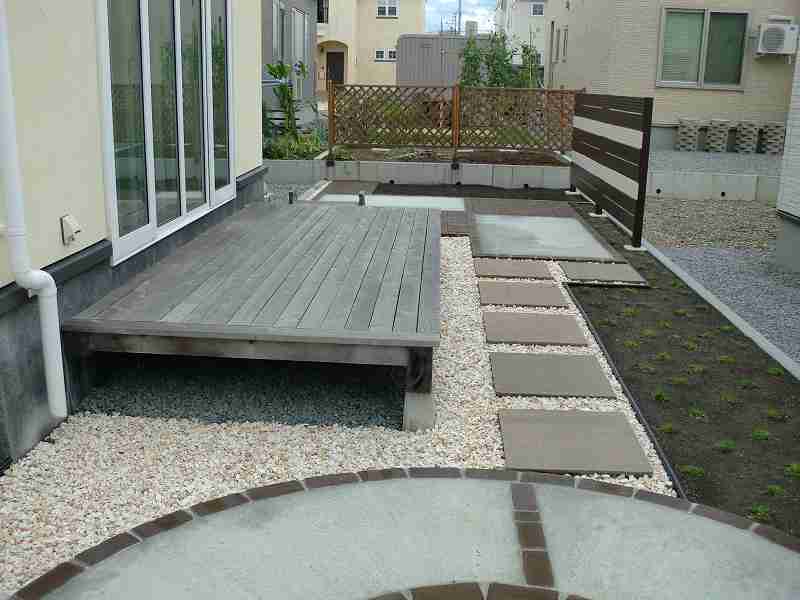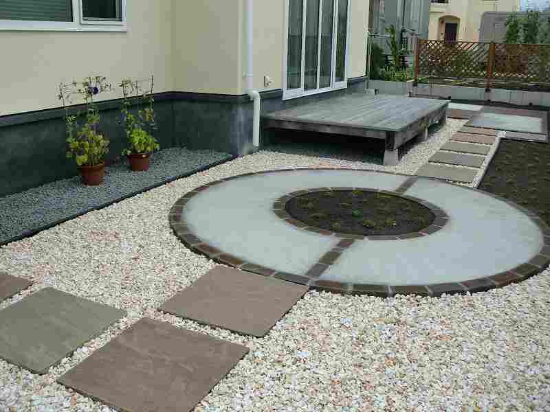 | 出来るだけメンテナンスの少ない庭にということで、テラスやサークル以外は化粧砂利にしていますが、全て防草シートを敷き雑草対策をしています。フェンスも表情豊かな木目調でありながらアルミ素材というフェンスなので、塗装などのメンテナンスは必要ありません。境界沿いの植栽スペースにはアイリッシュモスを植込み2年ほどで芝生のように一面緑に!丈も伸びることがないので、芝刈りのような作業もせずに緑が楽しめます。 |