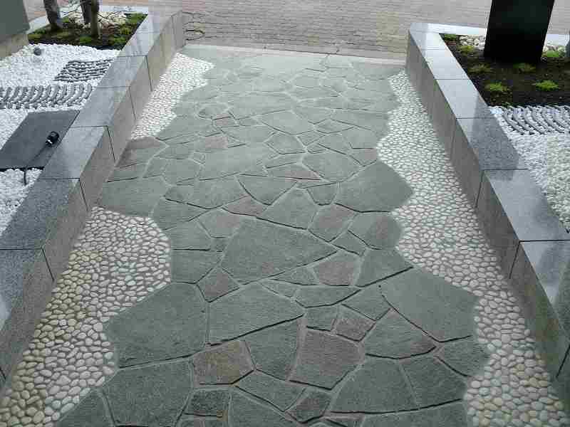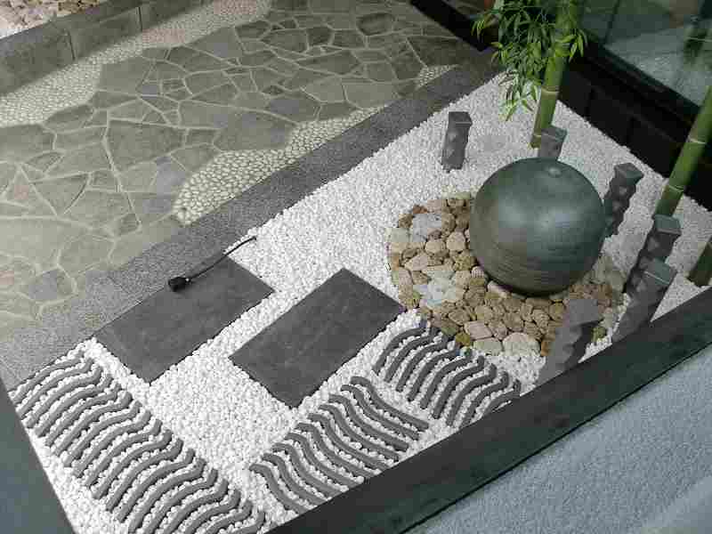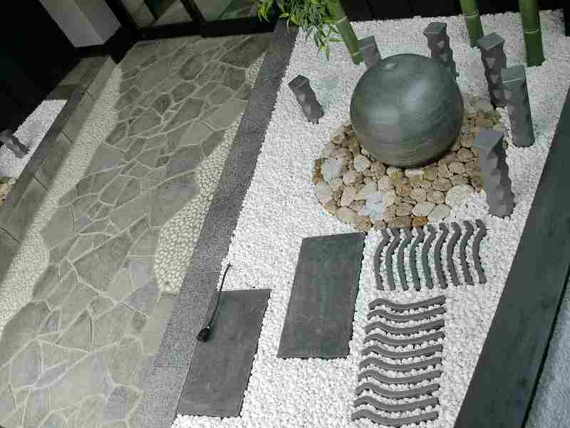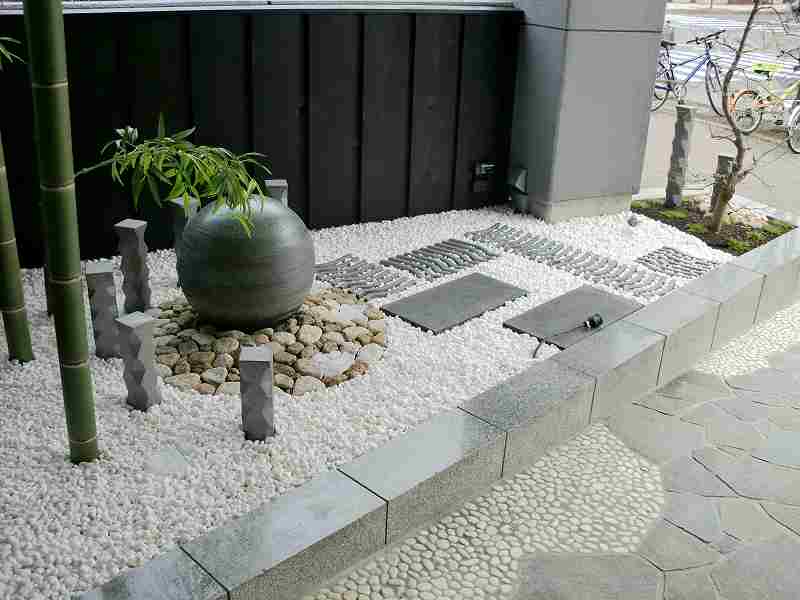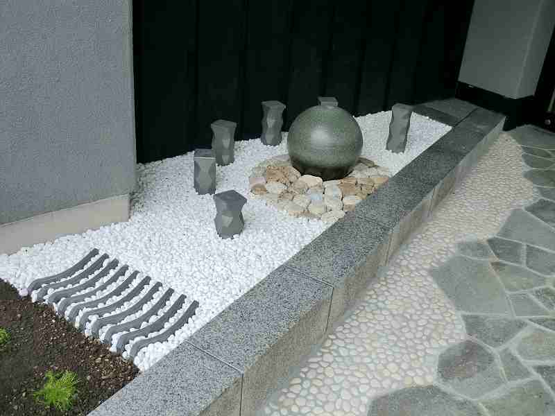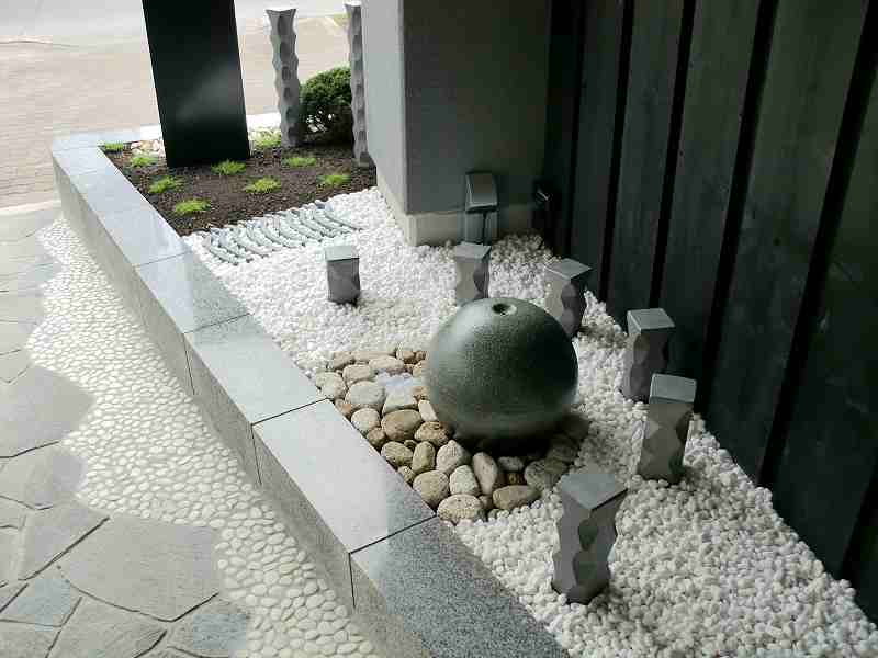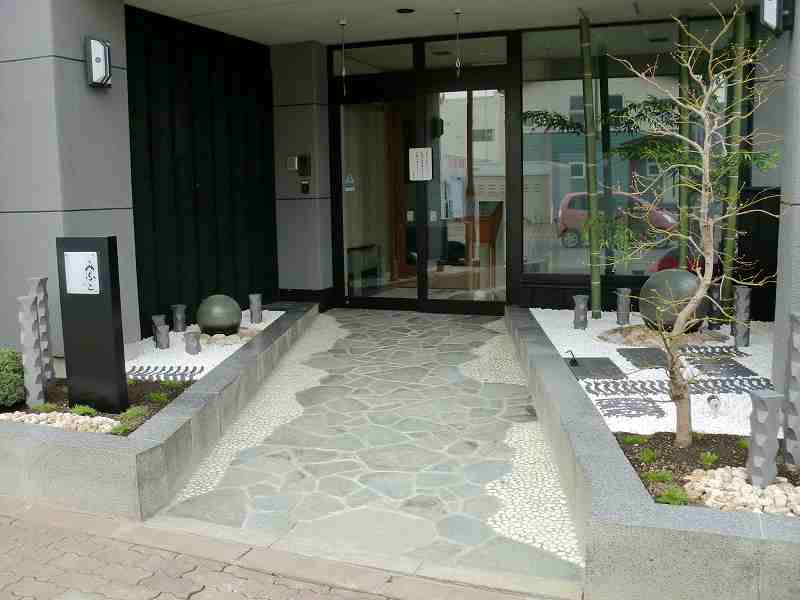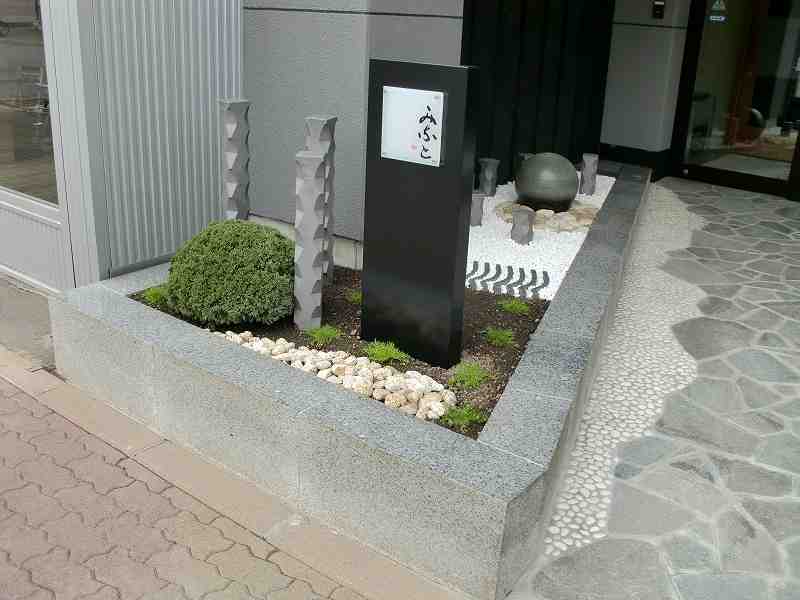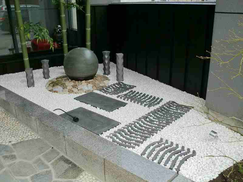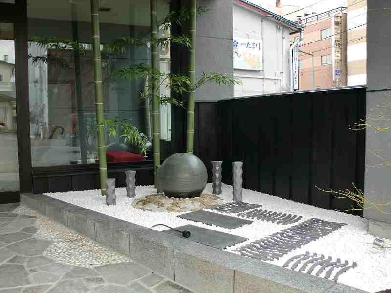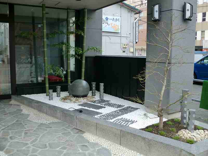 和を乱すことなく近代的に和のテイストを盛り込んだ庭にしました。店への入り口は屋根も掛かっているので、メンテナンスのことも考え植物を出来るだけ避けながら、お客様の目を引くような庭にすることに努めました。丸い陶器の玉からは水が零れ落ち、街中では聞けない水の音に耳を傾けたくなります。