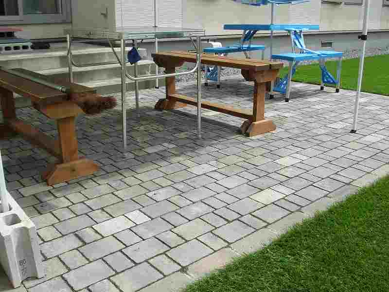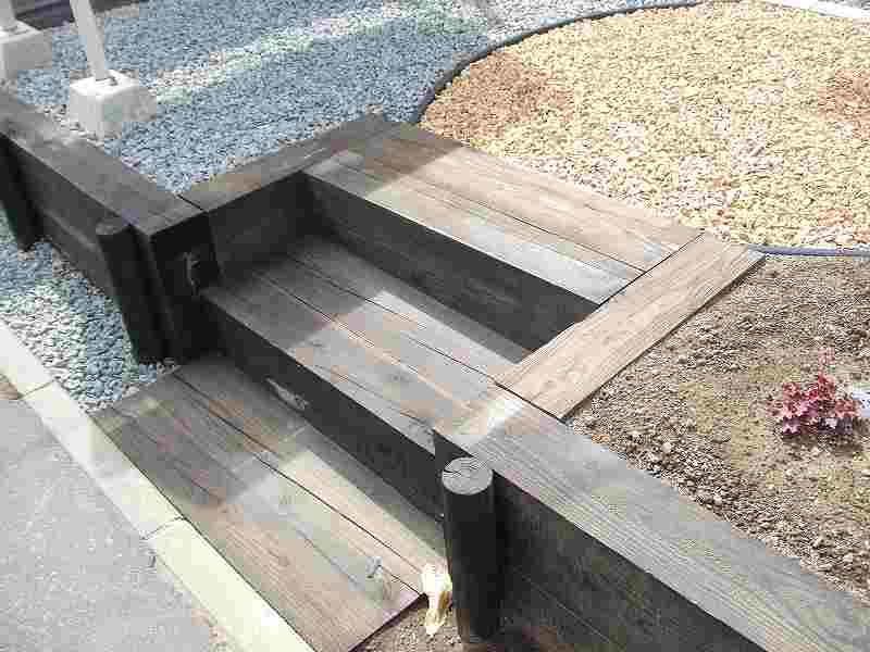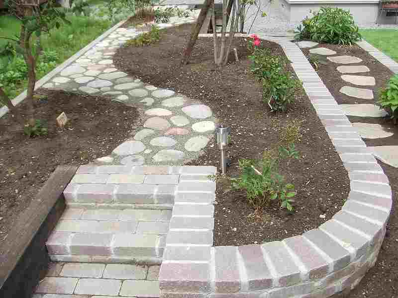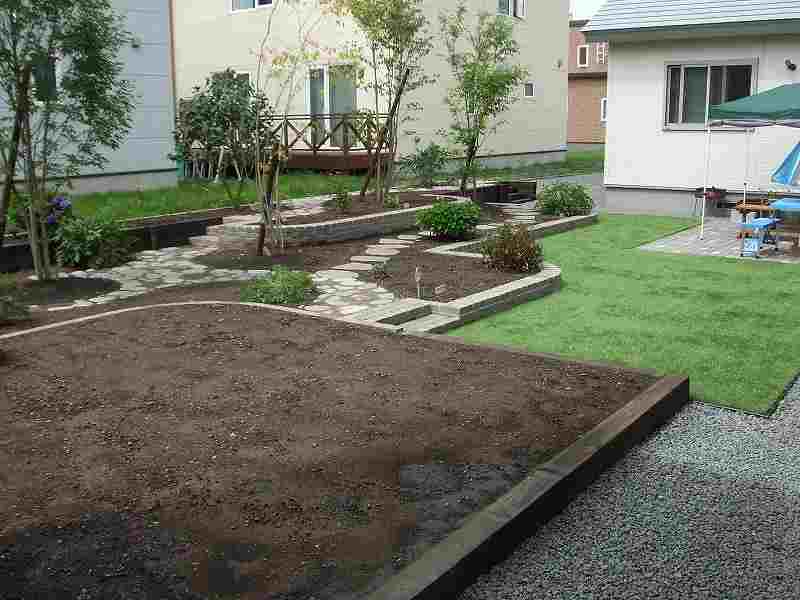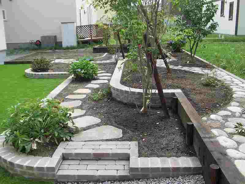 高低差のある庭で全体の色調はグレーをチョイス。グリーンのよく映える庭です。