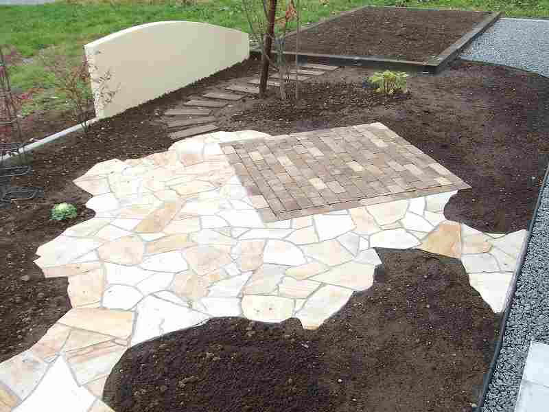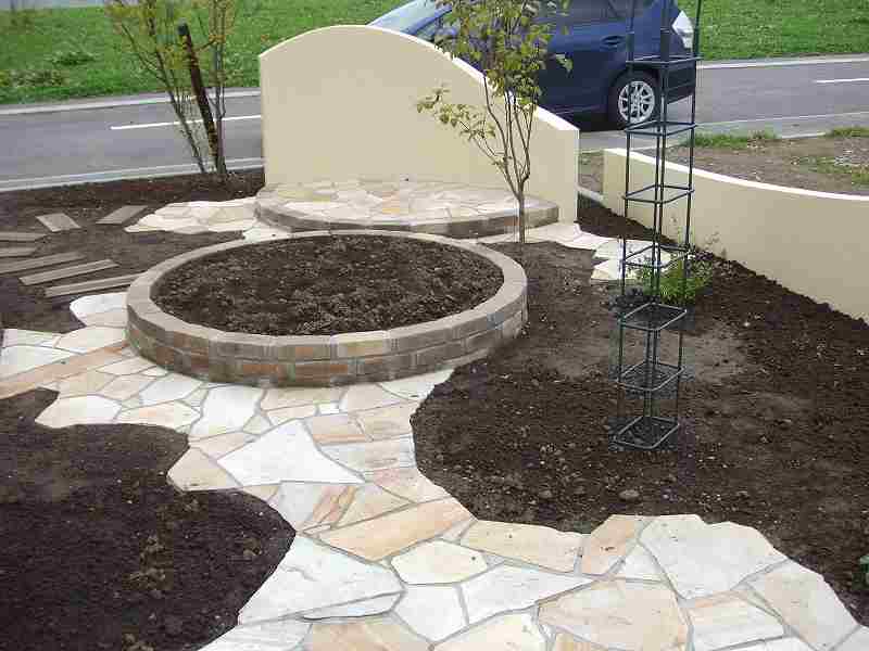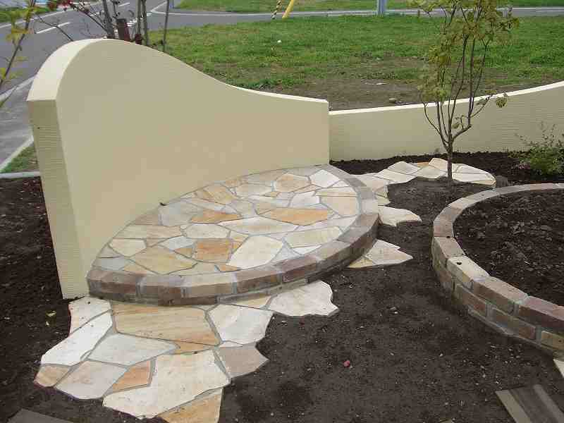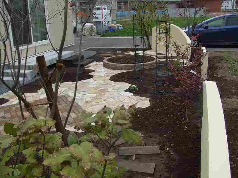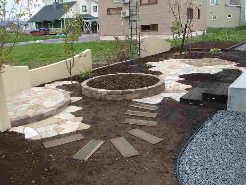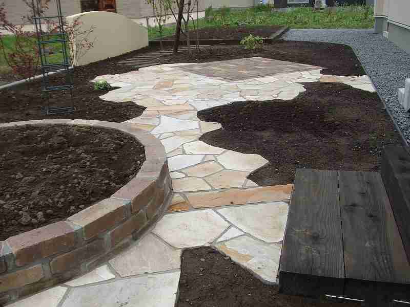 乱貼りのテラス、枕木の園路、レンガの花壇そしてRの塀。限られたスペースにハード面での変化をもたせました。