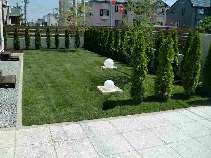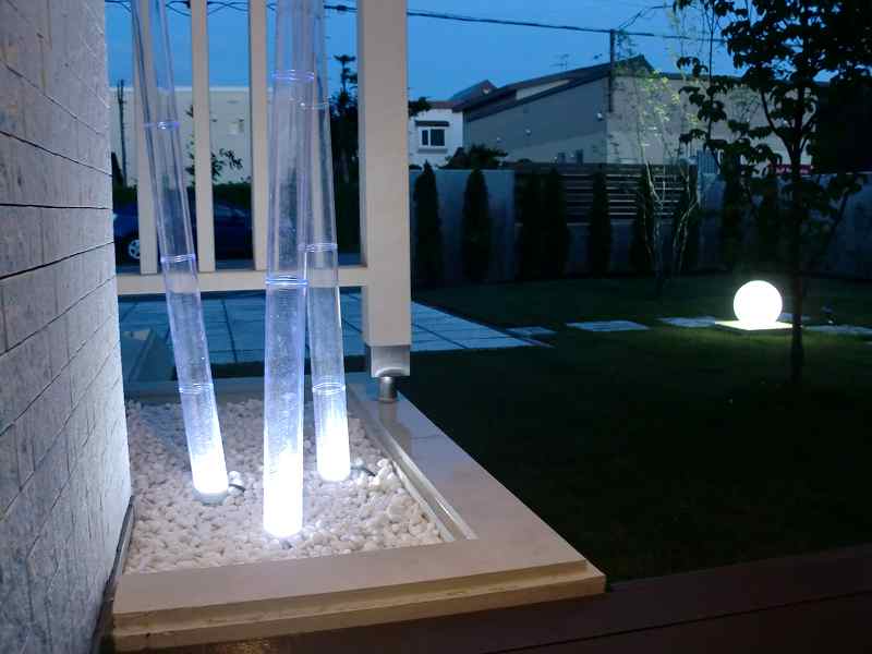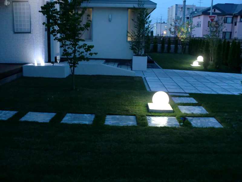 芝生を広くとり、周りもコンファーで囲み少しプライベートも意識しました。夜になるとライティングの光がガーデンライフの時間を長くしてくれます。