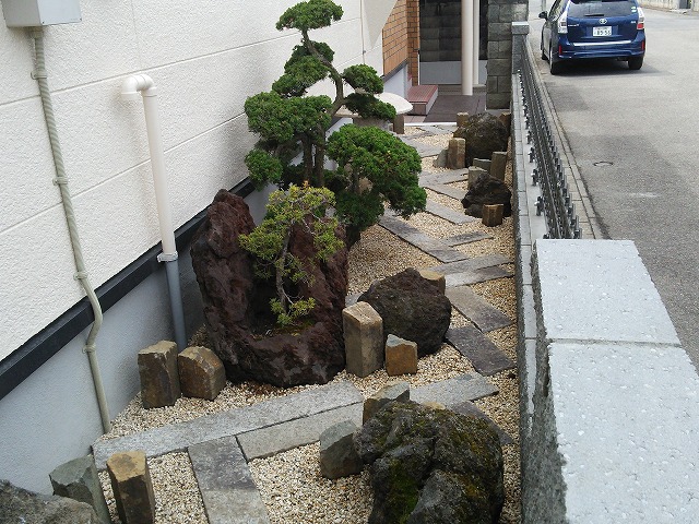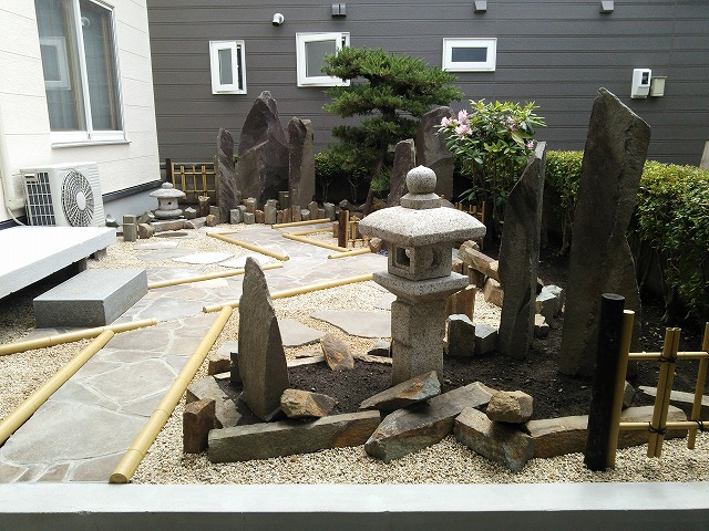 六方石を利用した和風庭園です。有名な層雲峡の柱状節理を縮景としてイメージしました。砂利の下には防草シートを敷設し、面倒な草取りを極力軽減。日当たりの条件的に、裸地には今後苔が生える予定です。一見大胆に見える立石の配置は、前から見て重ならないよう、かつ高さが揃わないよう、職人さんがもっとも気を使った部分です。