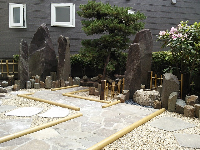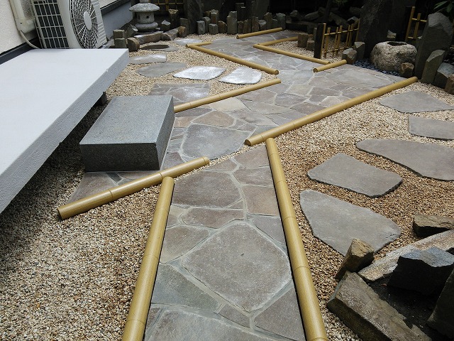ジャワ鉄平の乱貼り、縁取りは晒の人工竹です。こうすることで景色を引き締め、かつ園路の装飾性が高まりました。