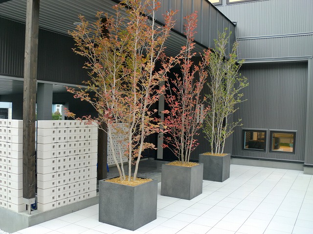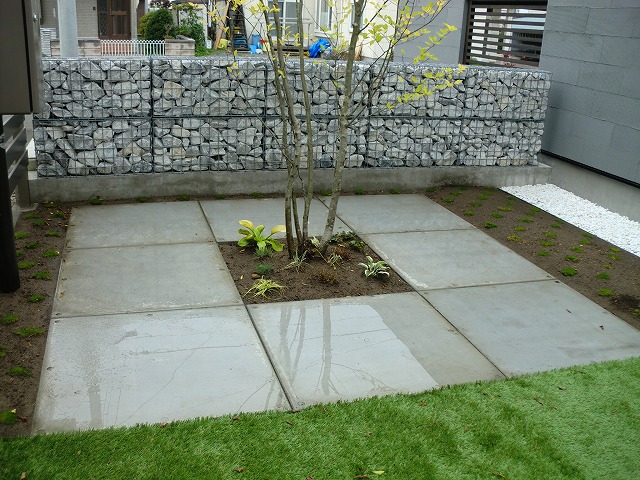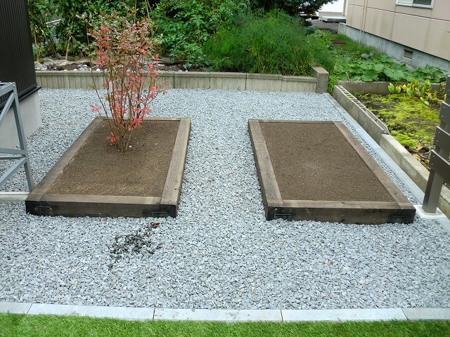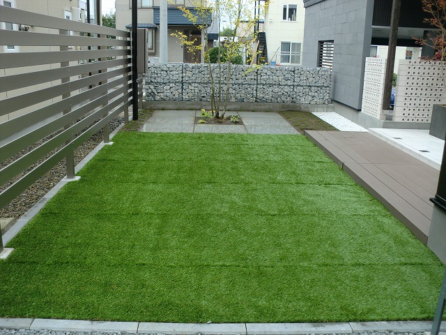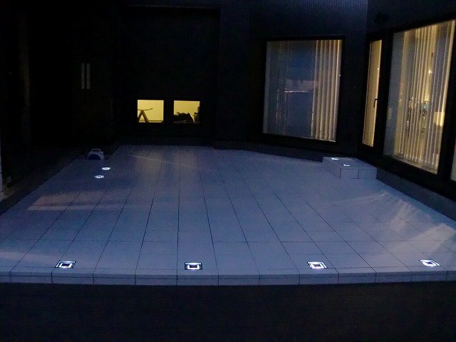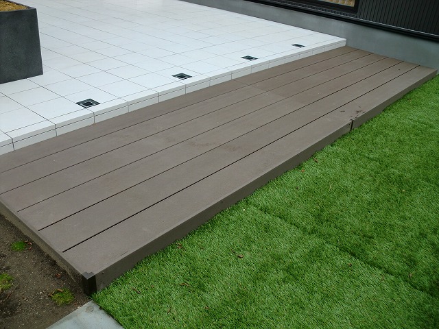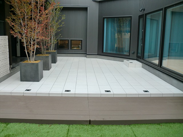 とにかくテラススペースを出来るだけ広くし、家族や友人と楽しく過ごせる空間にしました。全体的にもメンテナンスが掛からないものということで、人工木材やアルミなどを使い施工しています。メイングリーンは人工芝ですが、コンテナなどにも植栽を取り入れ家族で楽しめる菜園も完備!夜はテラスに埋め込んだソーラータイプのライティングがほんのりとした灯りで照らします。