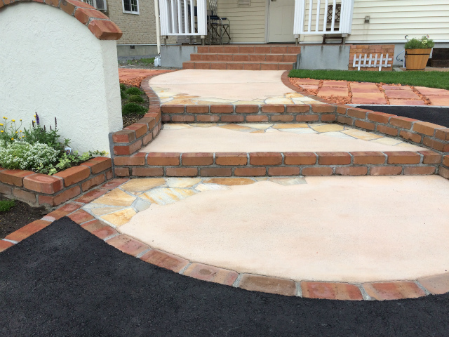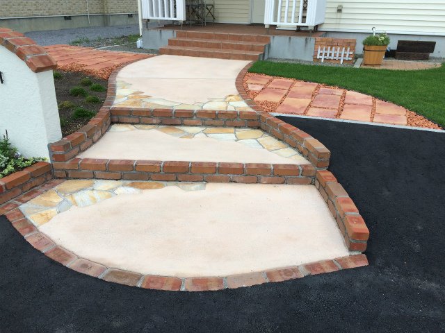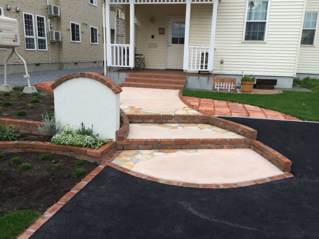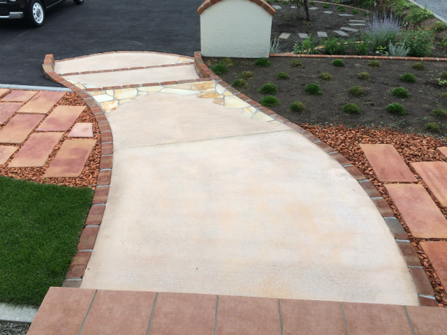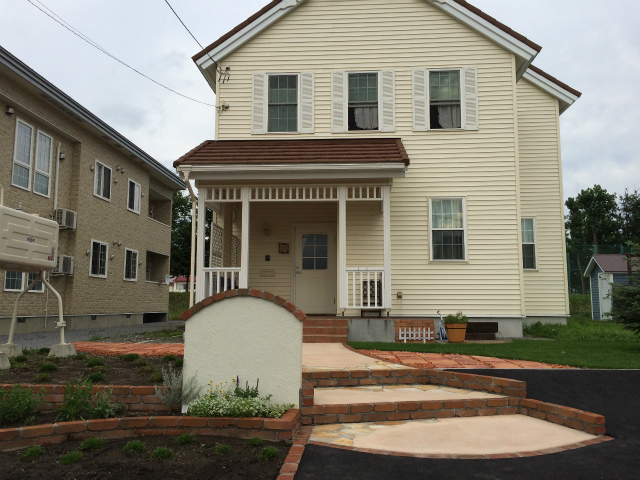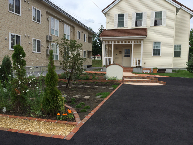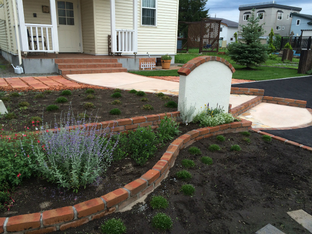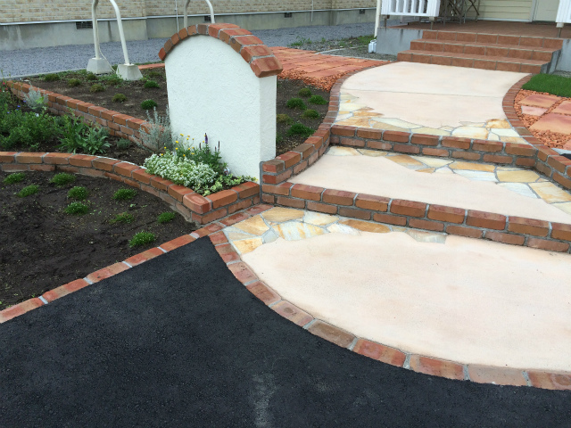 住宅の雰囲気に合わせ江別産レンガで統一。アプローチはコンクリートに着色材を加えて、暖かい感じの仕上がりにしました。高低差のある敷地でしたので、アプローチと植込みには段差を少しずつ付けて、高低差をあまり感じないようにしています。