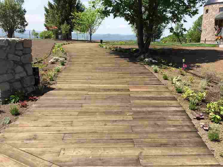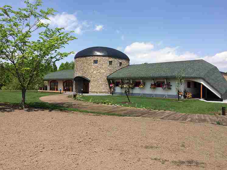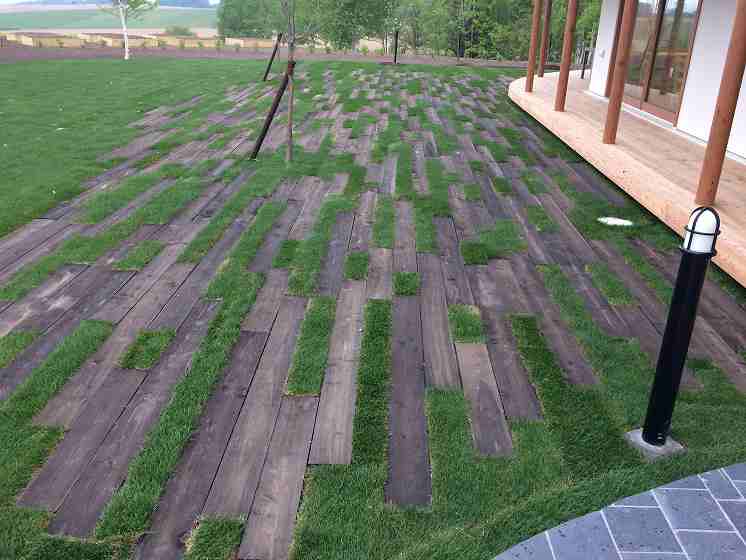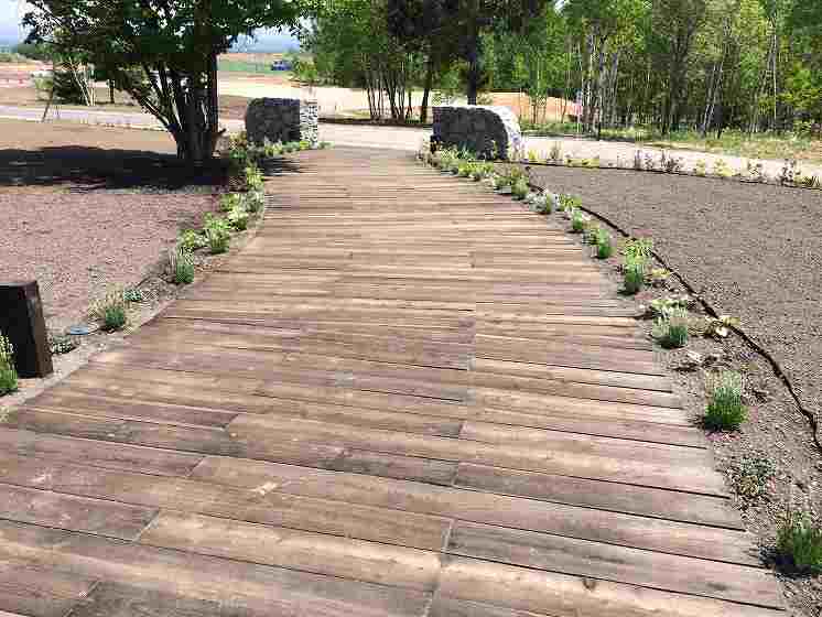 広大な美瑛の大地にシンプルですが広々とした芝生や、石の門を通り抜け店舗までのアプローチには四季折々の宿根草が楽しめます。