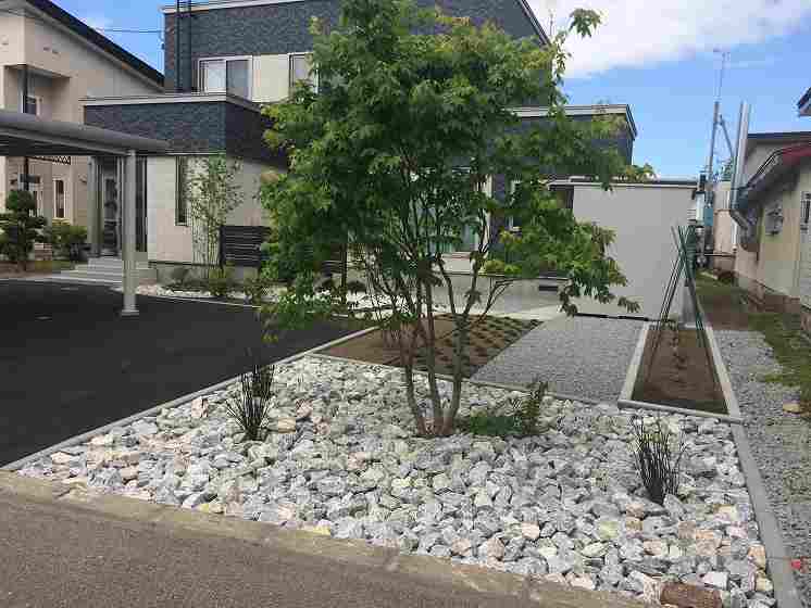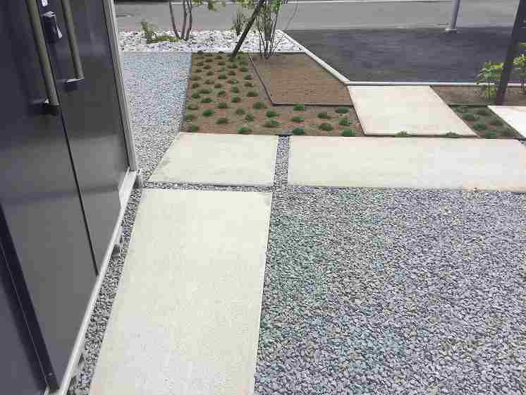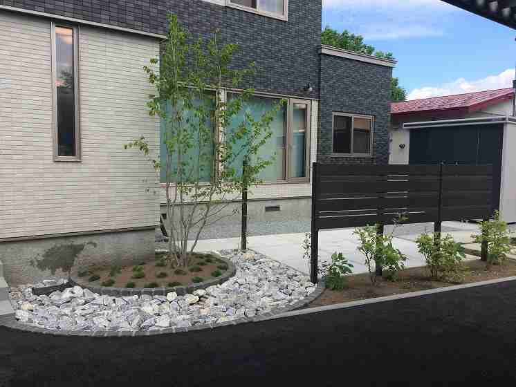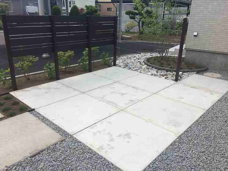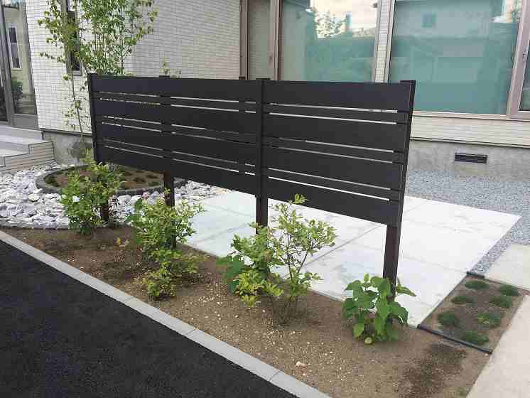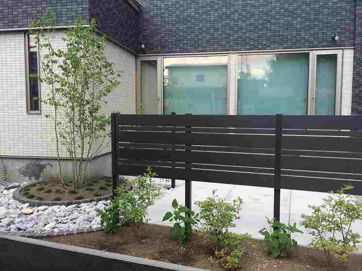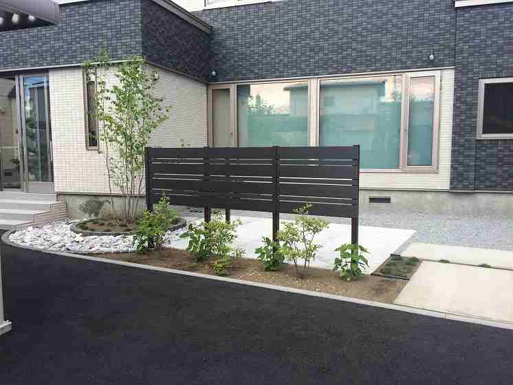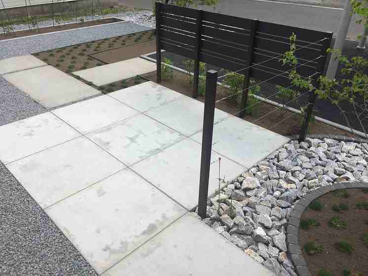シンプルな中に管理面も考えながら植栽も充実。フェンス正面は座った時にだけ目線を隠し、足元はかなり空いていますが、アジサイ(アナベル)が成長して足元を隠します。横面は何もないように見えますが、グリーンウォールといって柱間でワイヤーが張ってあり、シーズン中はクレマチス(センニンソウ)が伸びてくるとワイヤーに絡み合い、緑の壁を作って目隠しをしてくれます。同時に壁面でも緑を楽しんで頂けます。