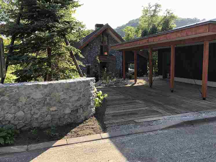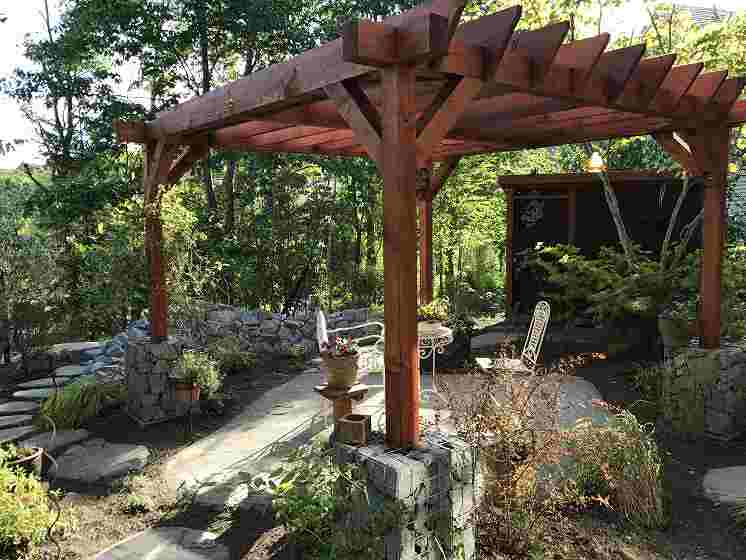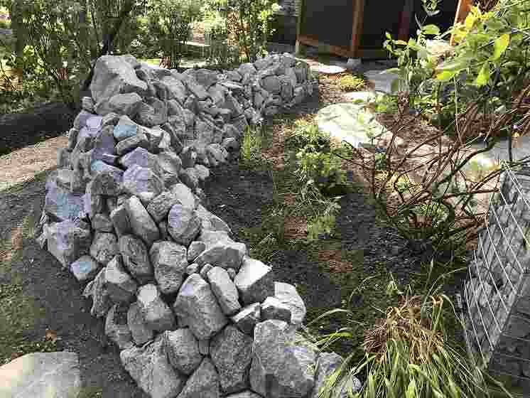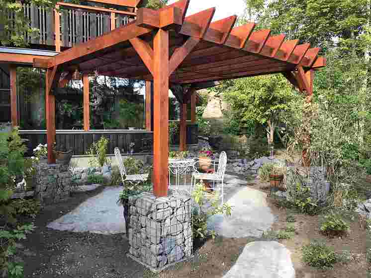 基礎部分ガビオンには石を詰めて迫力のある土台に。ガビオンにもクレマチス等のつる性植物を這わせます。メインガーデンはプライベートなスペースが充実していて元々ある林も庭に溶け込んでいます。 |