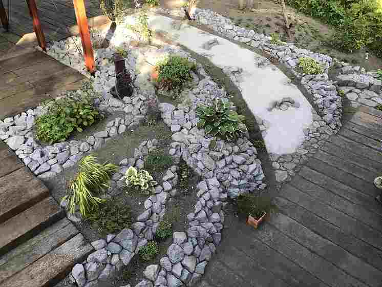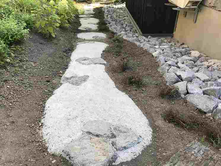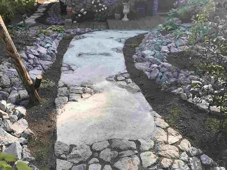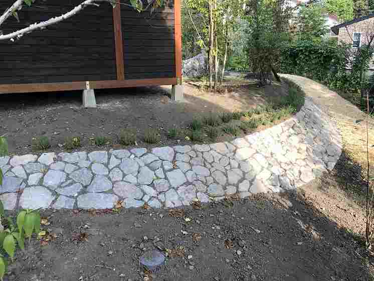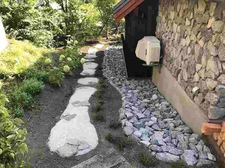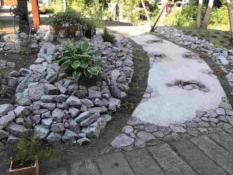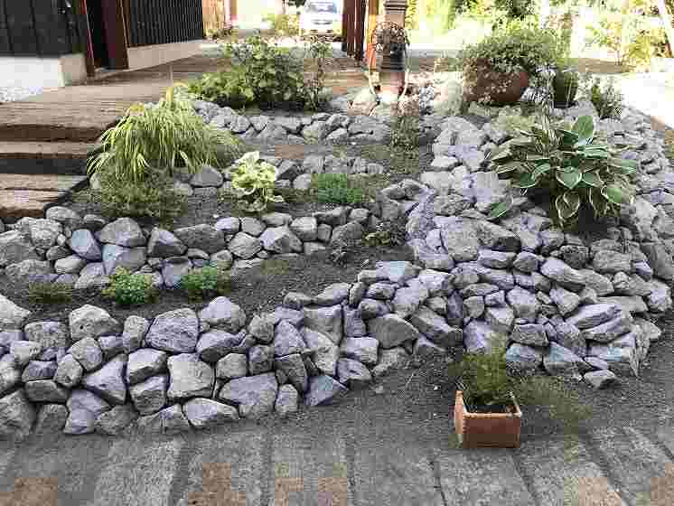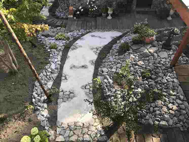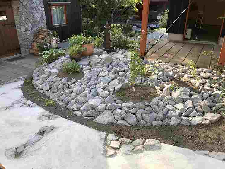 住宅の外壁にも使用されている原石をふんだんに庭の中の色々なシーンに使っています。