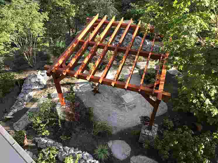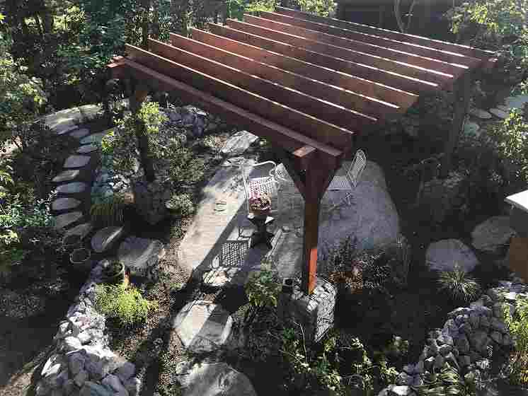 門柱、アプローチ、土留め、化粧砂利他・・・見た目にくどいように見えますが、その周りにある植栽が中和してくれます(将来的に)。アプローチ・テラスやガーデパスにはコンクリートを枠なしで流し、表面の仕上げもラフにしてナチュラル感を出しています。テラスには大きめのパーゴラを併設し元々あったブドウを這わせて日陰を作ります。