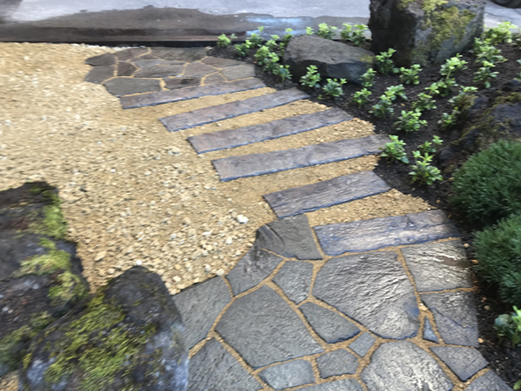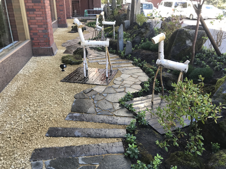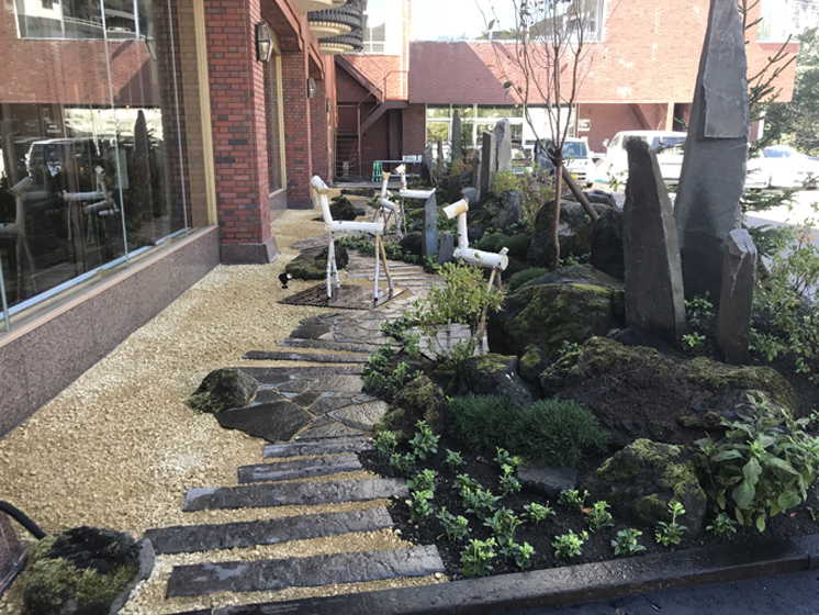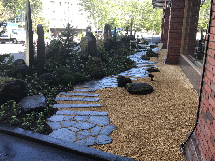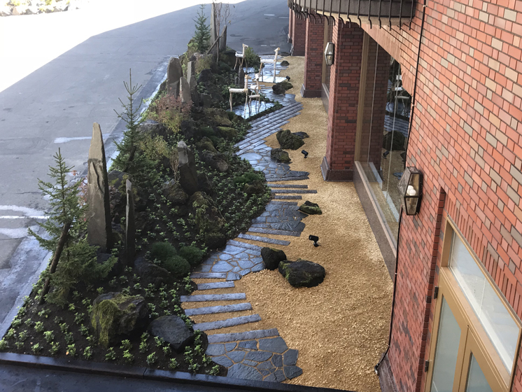 入口からホテルロビーの横まで、窓越しに見れる横長な庭となっています。
