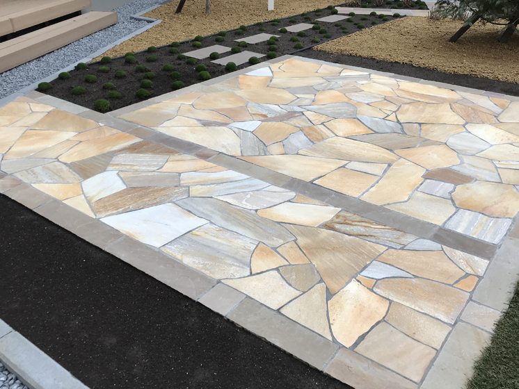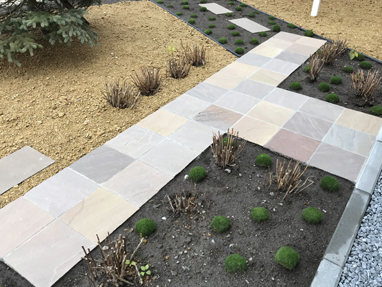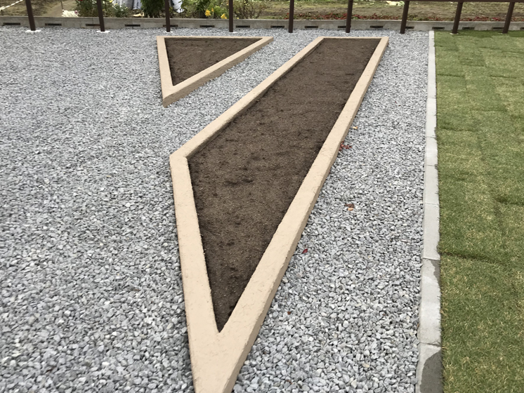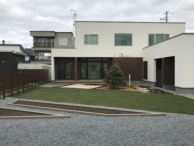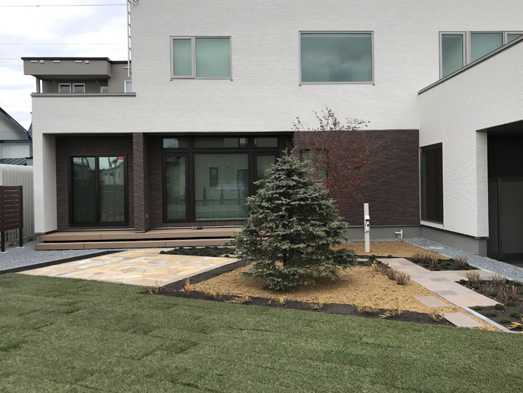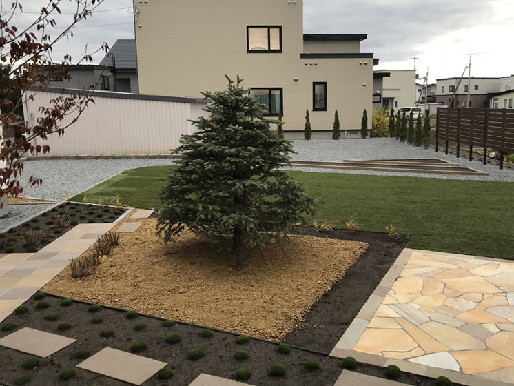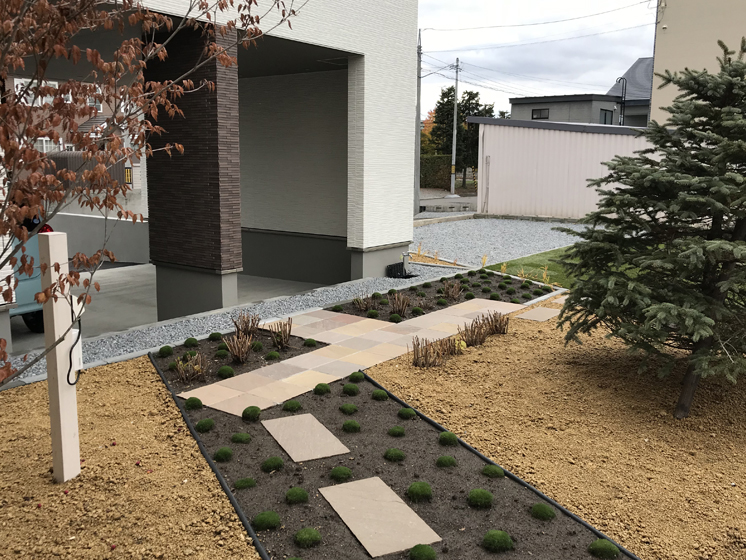 とても広いスペースの庭でしたので、住宅とは平行・直線にはせず10°だけ振り、変化を持たせテラスやガーデンパスなどを造りました。