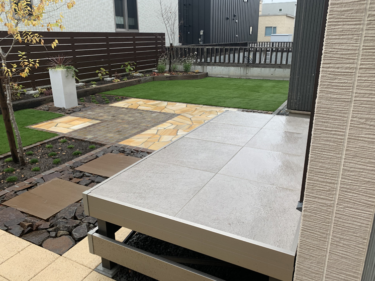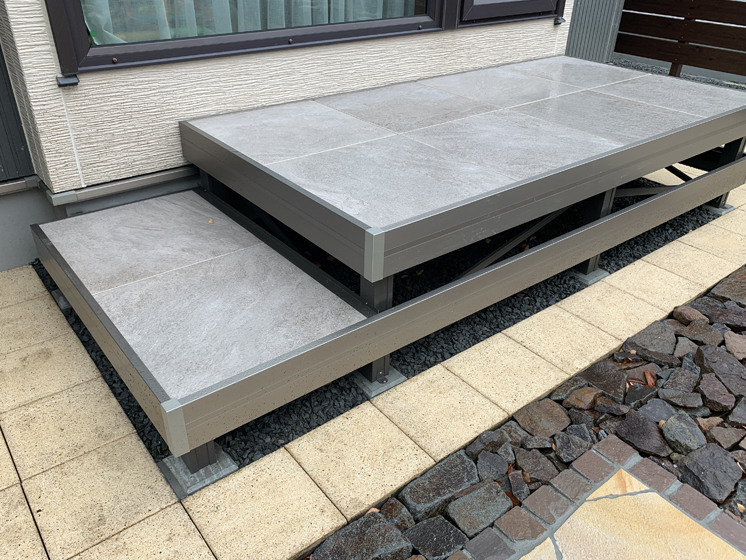アルミ素材(ウッド調)のフェンスでプライベートも守り、アルミ素材の為メンテナンスもフリー。元々あった広いウッドデッキも朽ちてしまい、タイルを使ったデッキでメンテナンスフリーにしています。