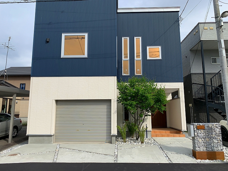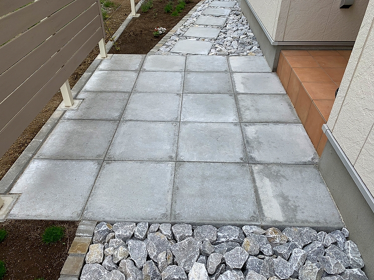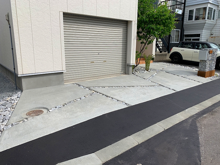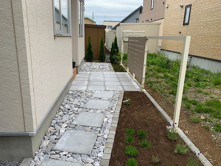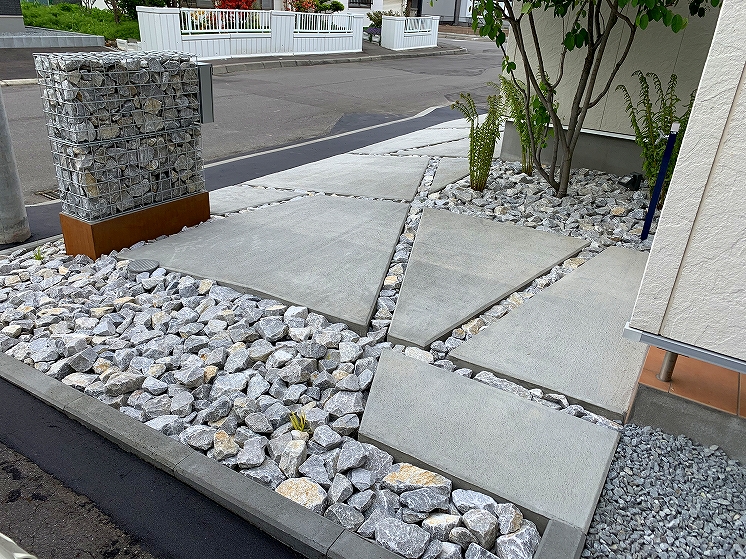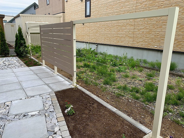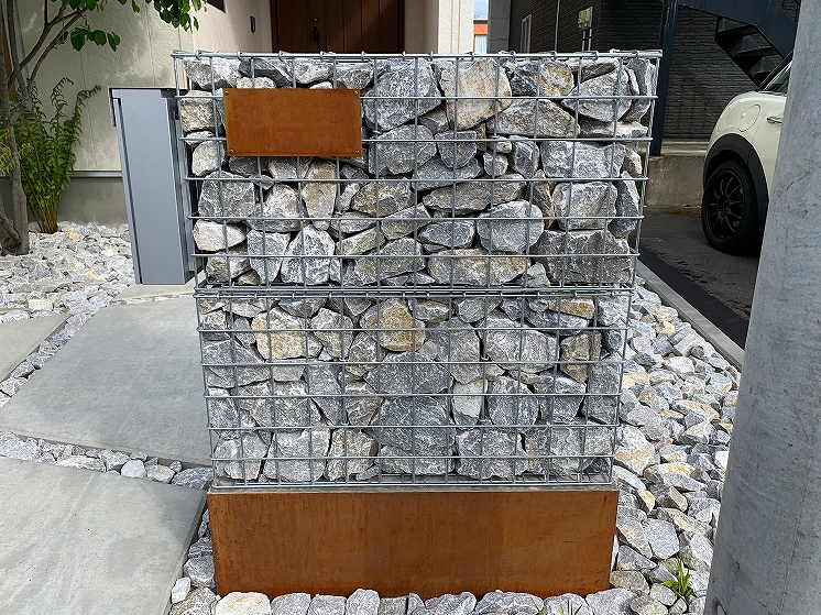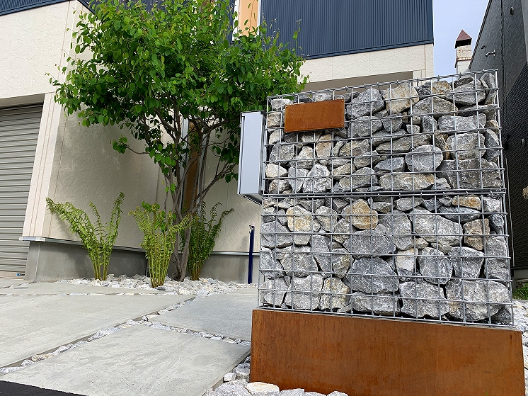 シンプルモダンにコンクリートを中心にデザインしました。門柱の土台にはコールテン鋼を使い表札と合わせています。裏にはも奥行きがなかった為、大きい樹木なども植えれなかったので、狭いスペースでも可能なクレマチスを植え、空間部分のワイヤーに這わせて緑が楽しめるようになっています。
